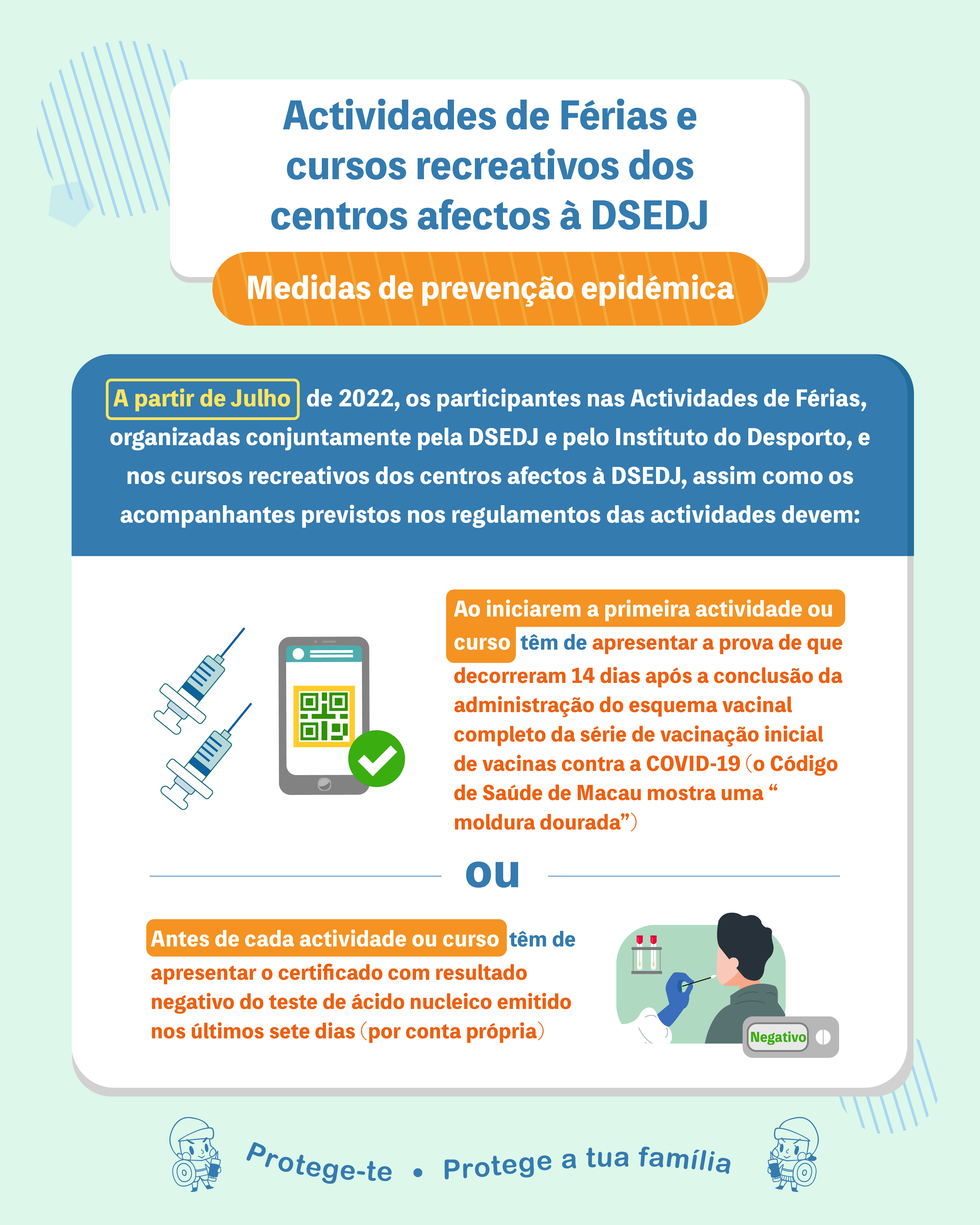 Face às necessidades de prevenção e controlo da situação epidémica e considerando a evolução epidémica nas regiões vizinhas, na perspectiva de garantir a saúde dos docentes e alunos, a Direcção dos Serviços de Educação e de Desenvolvimento da Juventude (DSEDJ), após comunicação com dirigentes de algumas escolas e associações locais, concluiu que, a partir de Julho de 2022, os participantes nas Actividades de Férias, organizadas conjuntamente pela DSEDJ e pelo Instituto do Desporto, e nos cursos recreativos dos centros afectos à DSEDJ, assim como os acompanhantes previstos nos regulamentos das actividades, ao iniciarem a primeira actividade ou curso, têm de apresentar a prova de que decorreram 14 dias após a conclusão da administração do esquema vacinal completo da série de vacinação inicial de vacinas contra a COVID-19 (o Código de Saúde de Macau mostra uma “moldura dourada”) ou, antes de cada actividade ou curso, o certificado de resultado negativo do teste de ácido nucleico emitido nos últimos sete dias (por conta própria).