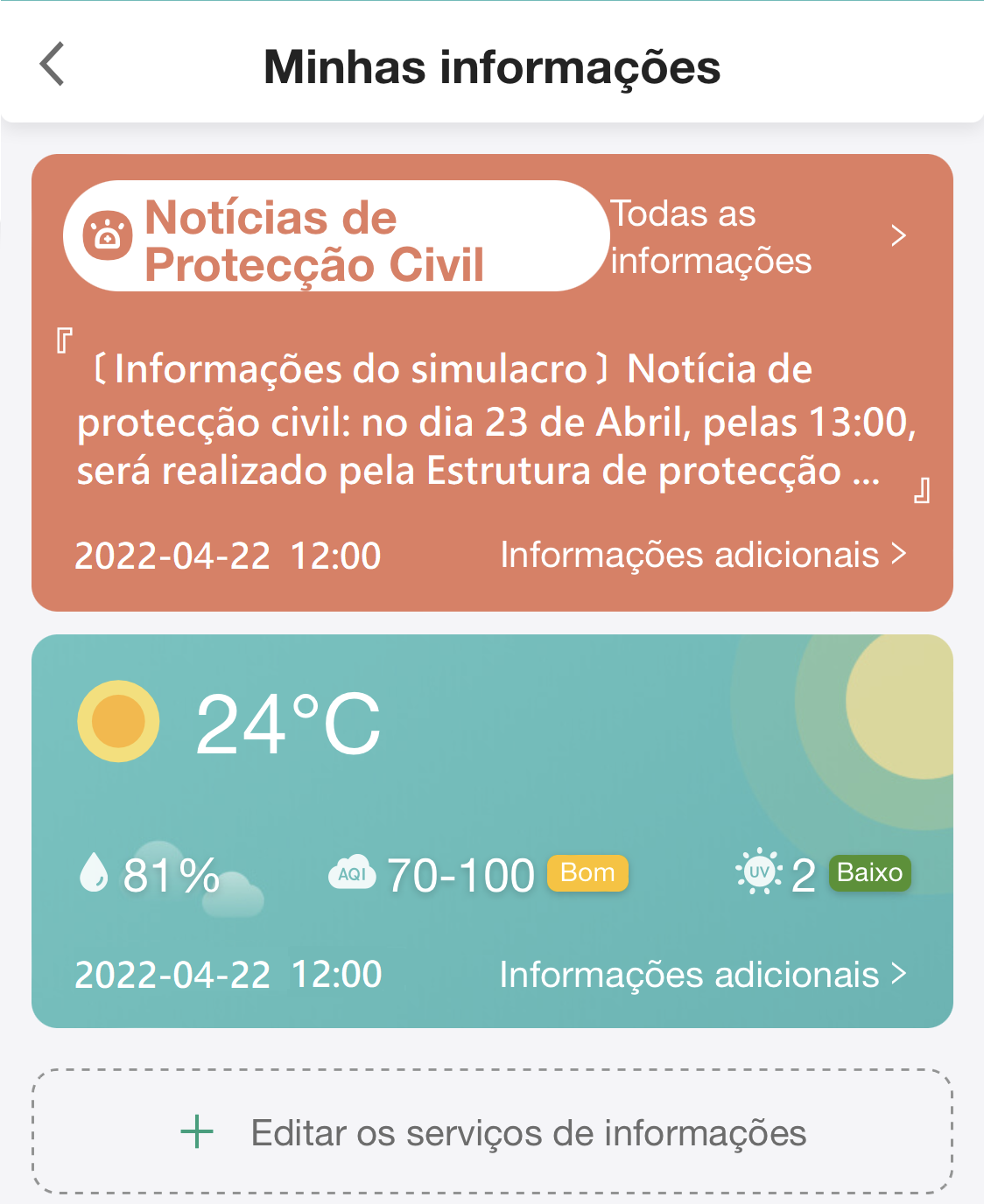 Para além do envio de informações, em “Notícias de Protecção Civil” constam, ainda, outras informações úteis, como, por exemplo, o mapa de acolhimento de emergência, no qual se pode verificar a área afectada por storm surge, sua localização e distância até aos centros de acolhimento de emergência e, ainda, uma lista de linhas abertas a utilizar para pedido de apoio e esclarecimento, tudo concebido no sentido de facilitar os cidadãos.