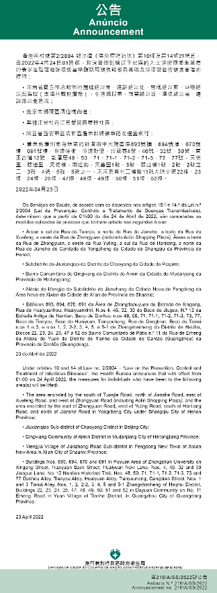 Tendo em consideração a evolução epidemiológica mais actualizada no Interior da China, os Serviços de Saúde, de acordo com os dispostos nos artigos 10.º e 14.º da Lei n.º 2/2004 (Lei de Prevenção, Controlo e Tratamento de Doenças Transmissíveis), determinam que a partir da 01h00 do dia 24 de Abril de 2022, todos os indivíduos que entrem ou já tenham entrado em Macau e tenham estado nos locais abaixo indicados, devem ser sujeitos à observação médica em local a designar, conforme exigências da autoridade de saúde, por um período de 14 dias a contar da data de saída destes locais, não podendo esse período ser inferior a 7 dias: