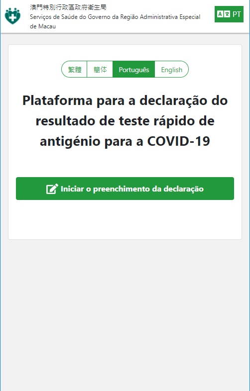 A fim de melhorar e optimizar as funções do “Código de Saúde de Macau”, o mesmo será actualizado às 00h00 de amanhã (dia 30 de Abril) passando a incorporar a exibição do resultado do teste de antigénio (vide imagem 1), e, simultaneamente, será lançada a “Plataforma de declaração do resultado do teste rápido de antigénio para a COVID-19” (vide imagem 2). Além disso, para reduzir o espaço ocupado pelas informações desnecessárias na página principal, o conteúdo das informações sobre vacinas foi simplificado e o gráfico do escudo foi removido passando a ser substituído pela moldura a cores.
