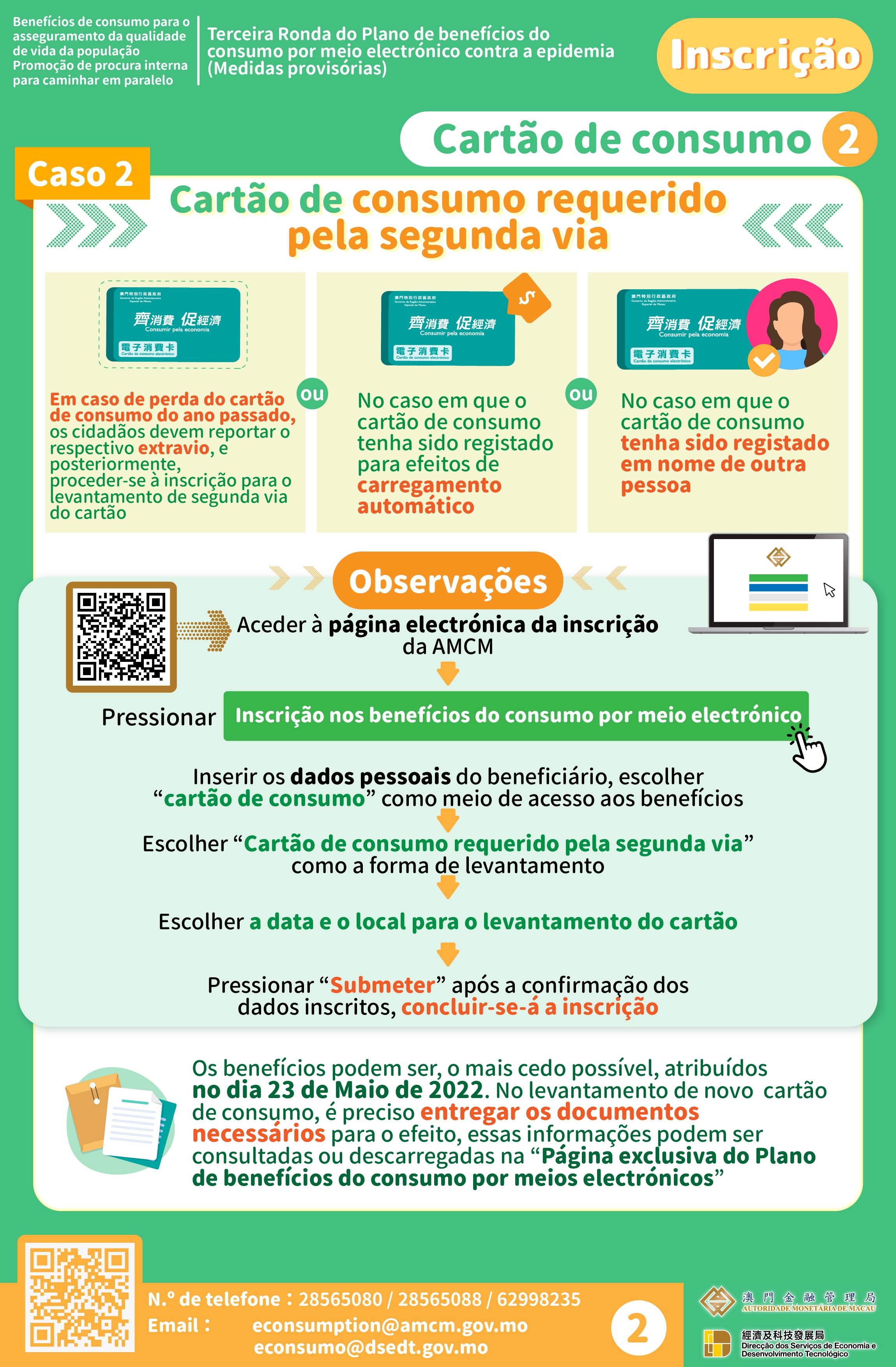 Em caso de extravio do “cartão de consumo” ou de cartão de consumo com função de carregamento automático, ou de cartão de consumo nominal em nome de outrem, o residente pode efectuar as formalidades para efeitos de emissão de segunda via do cartão. Os residentes que tenham perdido o cartão de consumo devem denunciar o respectivo extravio junto do Corpo de Polícia de Segurança Pública e, posteriormente, efectuar as formalidades para efeitos de emissão de segunda via do cartão.