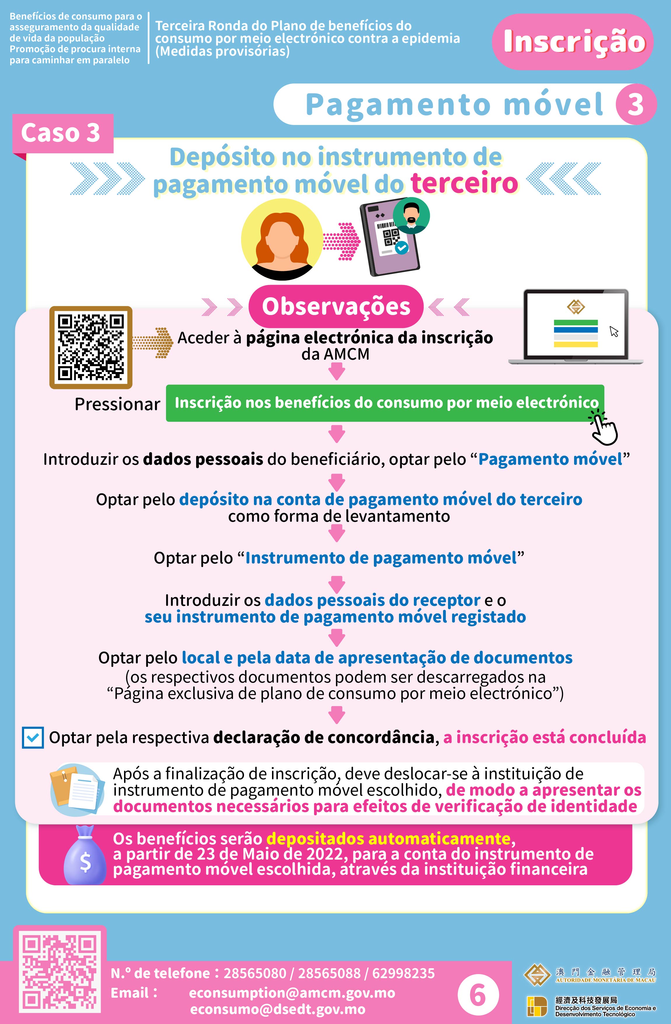 Tal como no ano passado, nas situações em que optem pelo meio de “pagamento móvel”, os residentes devem proceder, previamente, à abertura de uma conta autenticada com nome verdadeiro junto da respectiva instituição financeira participante neste plano. Aquando da realização da inscrição, os residentes podem optar pelo depósito dos benefícios do consumo na referida conta autenticada com nome verdadeiro, ou pela transferência dos benefícios do consumo para a conta autenticada com nome verdadeiro de terceiro.