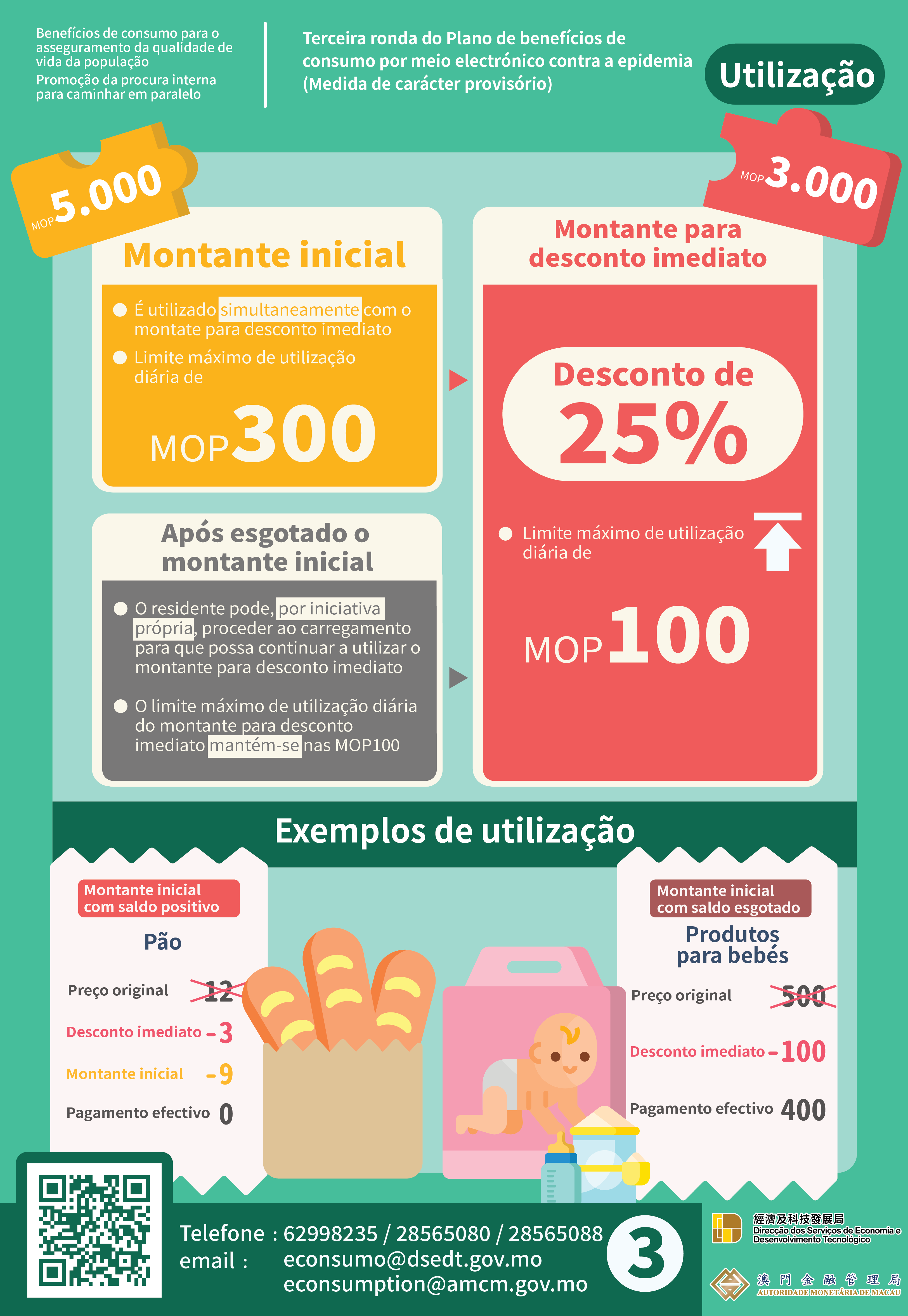 Para esclarecimento de quaisquer dúvidas acerca da “Terceira ronda do Plano de benefícios de consumo por meio electrónico contra a epidemia”, queira por favor consultar a página exclusiva da Terceira ronda do Plano (https://www.dsedt.gov.mo/econsumo), ou solicitar informações, durante o horário de expediente (De 2.ª feira a 6.ª feira, entre as 9:00 horas e as 13:00 horas e entre as 14:30 horas e as 17:45 horas), através dos seguintes meios:
