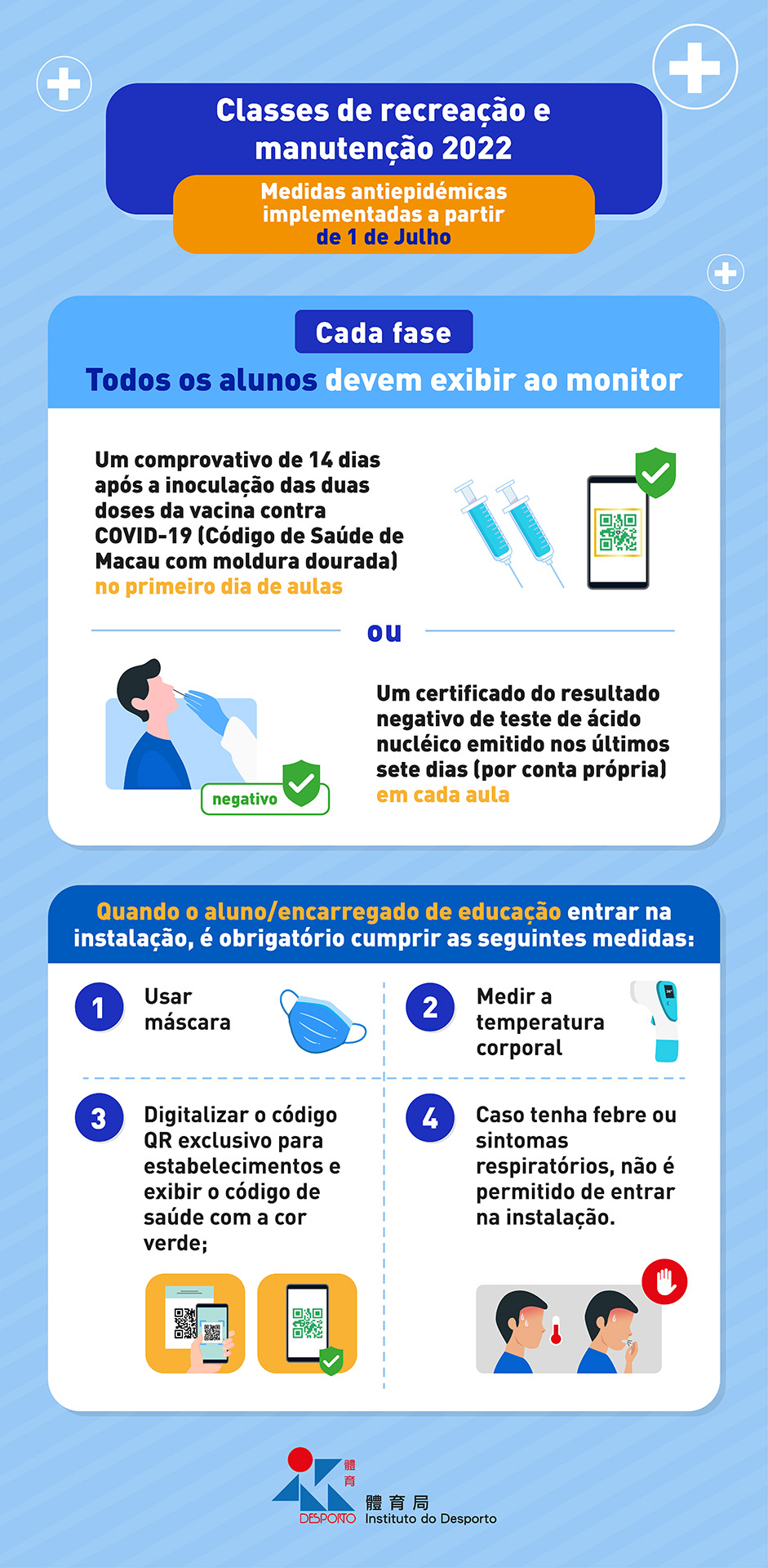 Tendo em conta as necessidades de prevenção da pandemia, o Instituto do Desporto implementará as novas medidas antiepidémicas nas classes de recreação e manutenção a partir de 1 de Julho. Todos os alunos que participam nas classes de recreação e manutenção devem exibir um comprovativo de ter completado 14 dias após a inoculação da 2ª. dose da vacina contra a COVID-19 (Código de Saúde com “Quadro dourado”) no primeiro dia de aulas de cada fase (sendo dois meses a duração de cada fase) ou apresentar o certificado de teste negativo de ácido nucleico realizado no prazo de 7 dias em cada aula, cujo procedimento do teste bem como as despesas envolvidas será a cargo próprio.