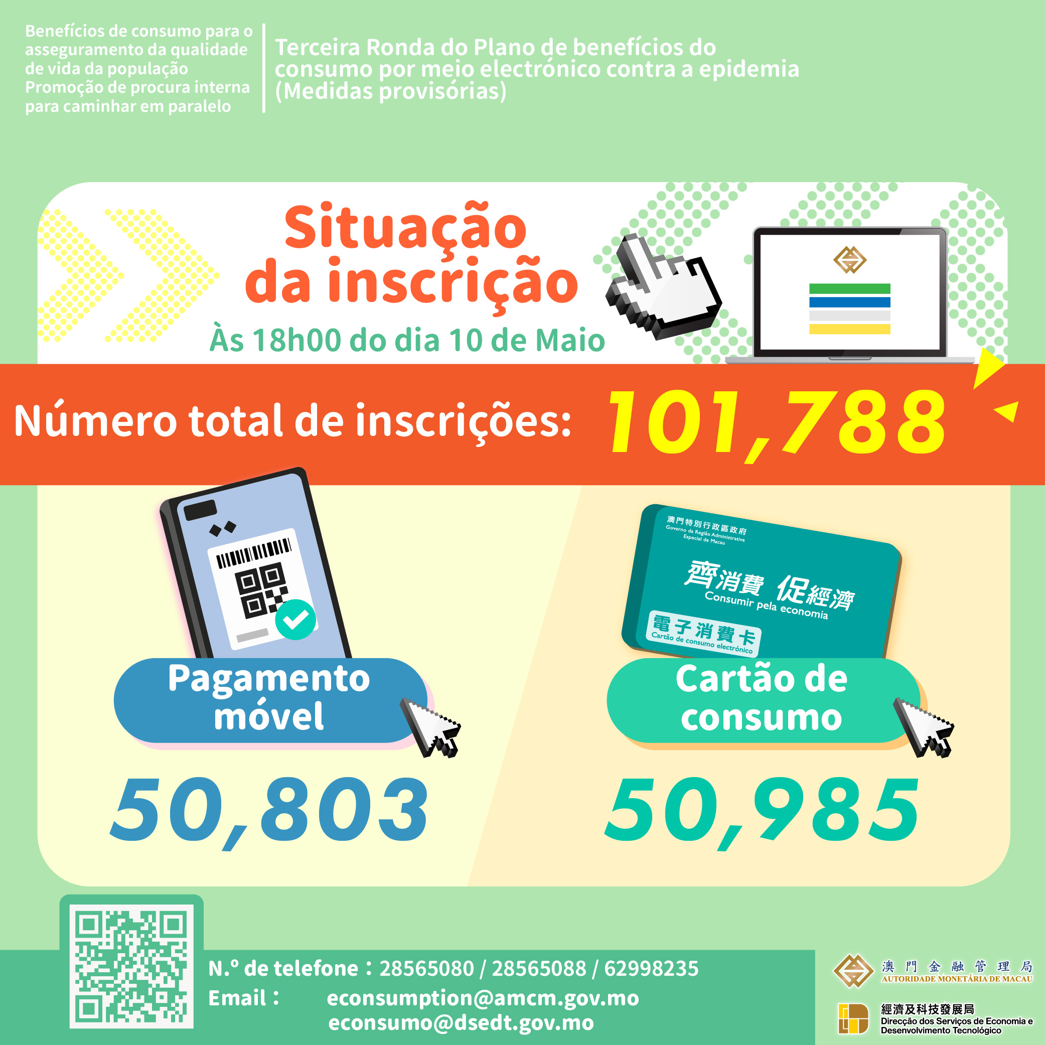 O período de inscrição da “Terceira Ronda do Plano de benefícios do consumo por meio electrónico” decorre, a partir de hoje (dia 10), sendo que, até às 18:00 horas, 101.788 residentes tinham concluído a sua inscrição, dos quais 50.803 residentes optaram pelo “meio de pagamento móvel” e 50.985 pelo “cartão de consumo”, para este efeito.