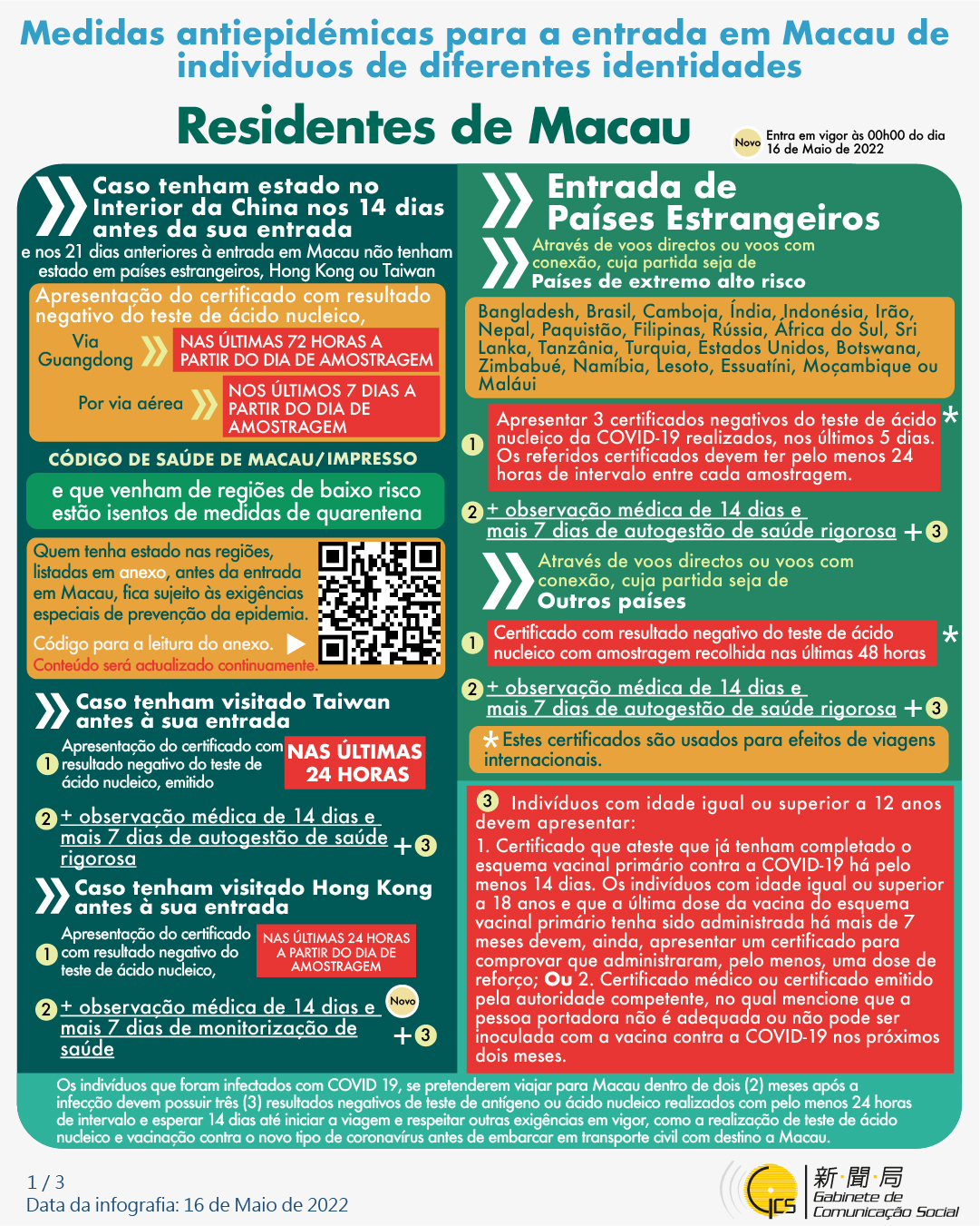 (Infografia)Medidas antiepidémicas para a entrada em Macau de indivíduos de diferentes identidades, actualizadas no dia 16 de Maio de 2022