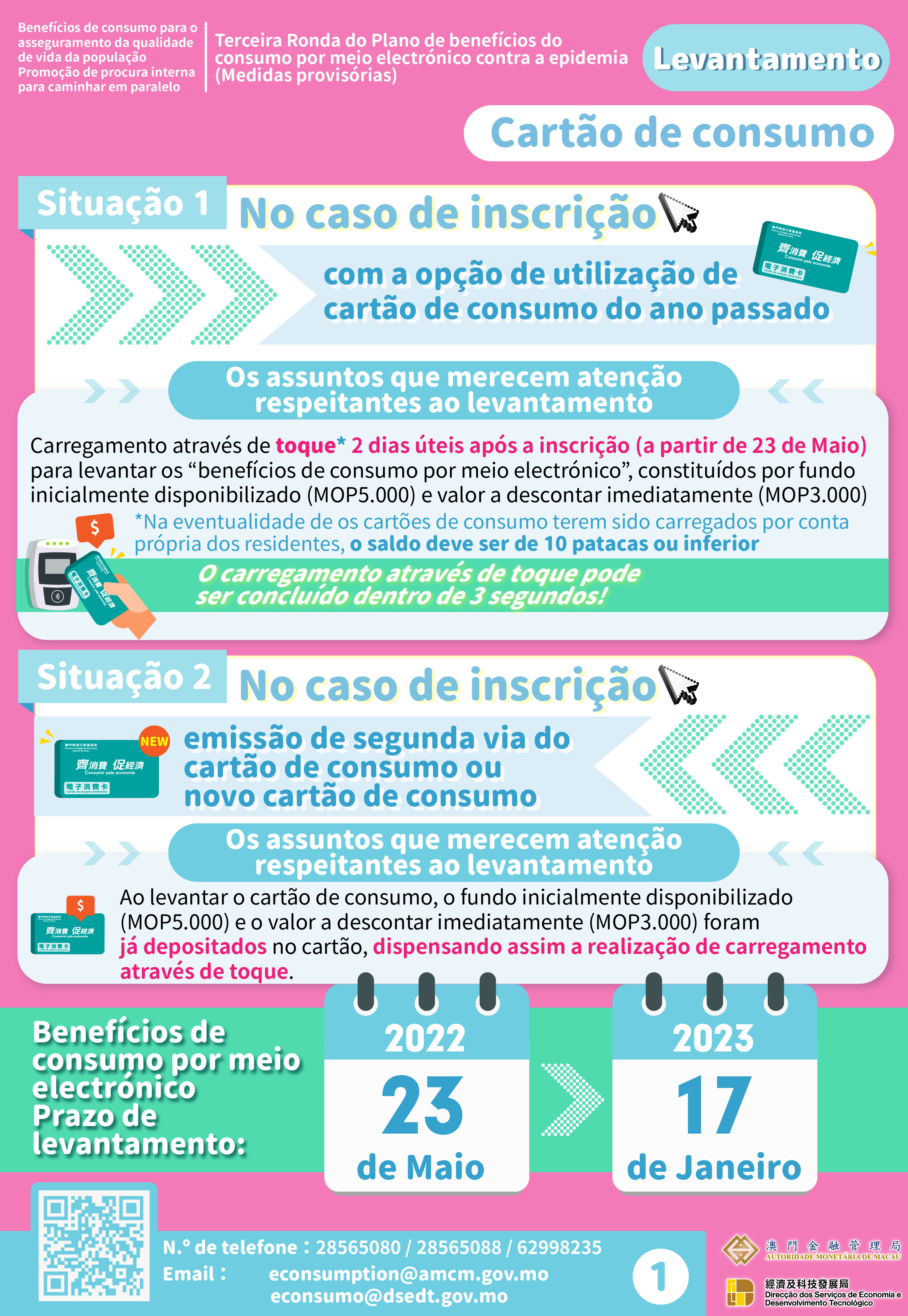 Os residentes que optem por receber os benefícios por “cartão de consumo” e tenham a sua inscrição com sucesso e verificada, antes de 18 de Maio, poderão receber os benefícios através do carregamento do seu cartão de consumo a partir da próxima segunda-feira (dia 23 de Maio), sendo o processo célere e dar-se por concluído dentro de 3 segundos.