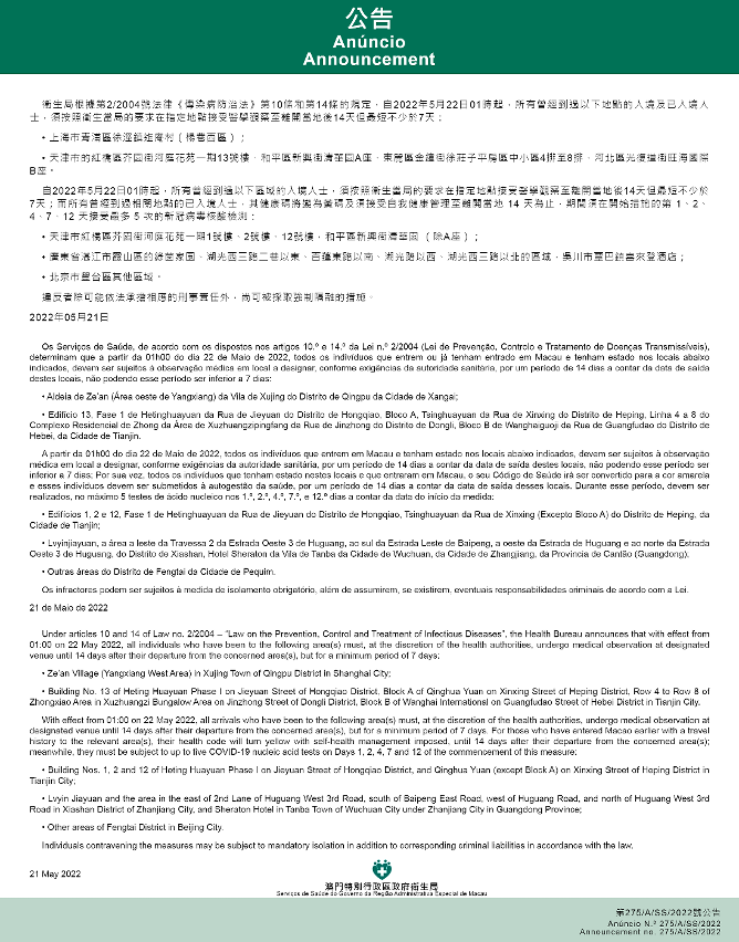 Tendo em consideração a evolução epidemiológica mais actualizada no Interior da China, os Serviços de Saúde, de acordo com os dispostos nos artigos 10.º e 14.º da Lei n.º 2/2004 (Lei de Prevenção, Controlo e Tratamento de Doenças Transmissíveis), determinam que a partir da 01h00 do dia 22 de Maio de 2022, todos os indivíduos que entrem ou já tenham entrado em Macau e tenham estado nos locais abaixo indicados, devem ser sujeitos à observação médica em local a designar, conforme exigências da autoridade sanitária, por um período de 14 dias a contar da data de saída destes locais, não podendo esse período ser inferior a 7 dias: