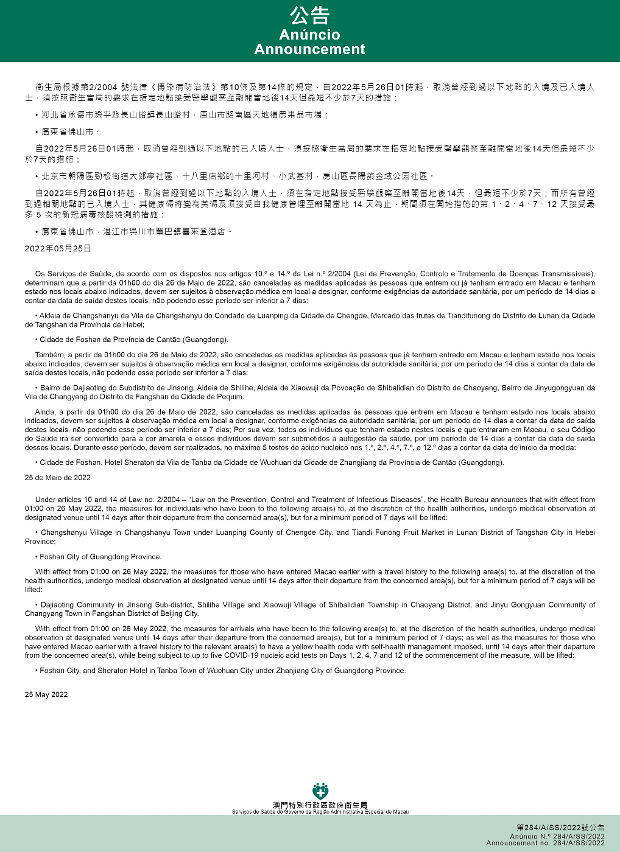 Tendo em consideração a evolução epidemiológica mais actualizada no Interior da China, os Serviços de Saúde, de acordo com os dispostos nos artigos 10.º e 14.º da Lei n.º 2/2004 (Lei de Prevenção, Controlo e Tratamento de Doenças Transmissíveis), determinam que a partir da 01h00 do dia 26 de Maio de 2022, todos os indivíduos que entrem ou já tenham entrado em Macau e tenham estado nos locais abaixo indicados, devem ser sujeitos à observação médica em local a designar, conforme exigências da autoridade sanitária, por um período de 14 dias a contar da data de saída destes locais, não podendo esse período ser inferior a 7 dias: