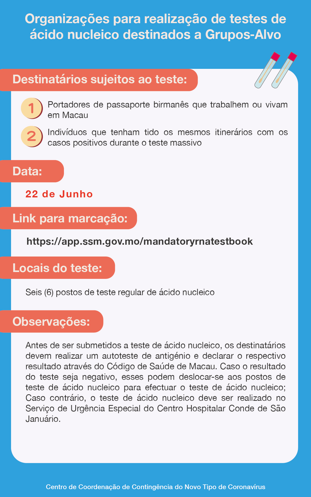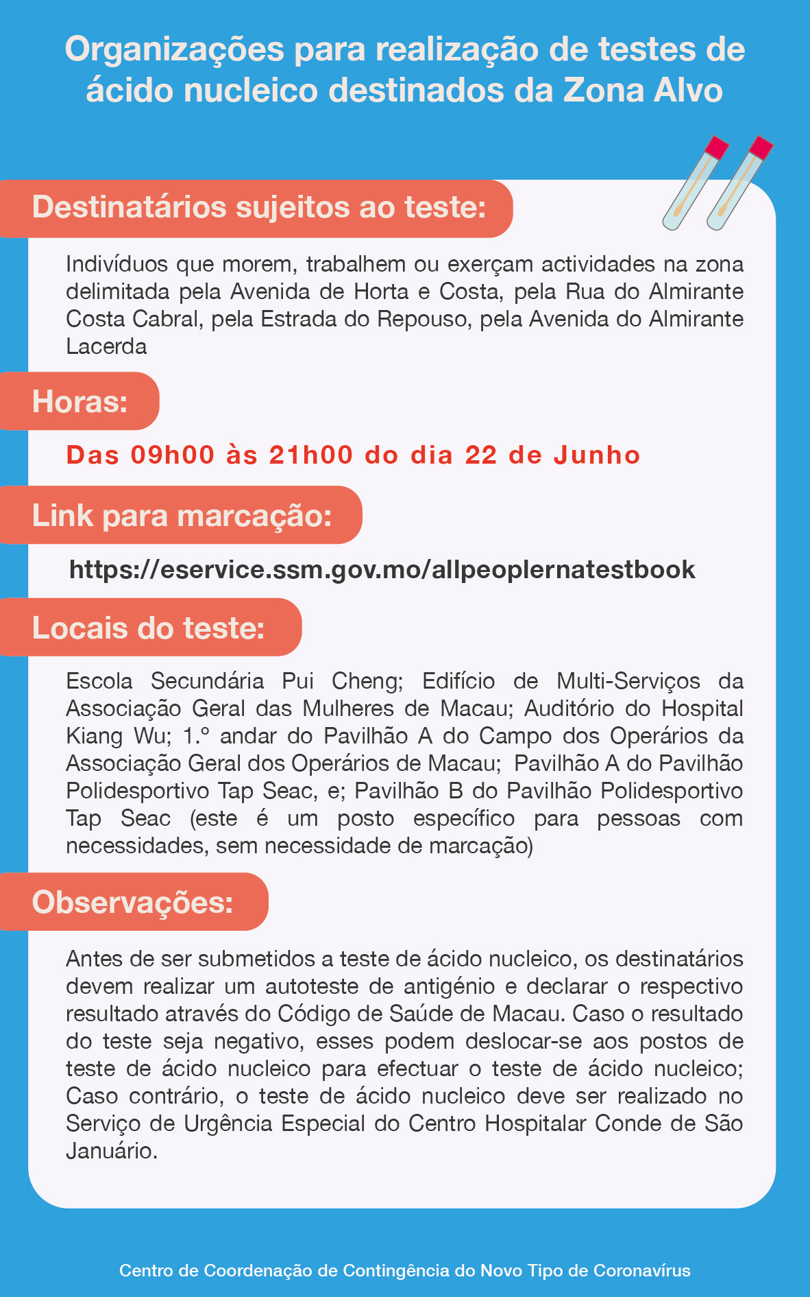 Estas pessoas devem efectuar uma marcação no dia 22 de Junho, através do seguinte link de despistagem gratuita: https://app.ssm.gov.mo/mandatoryrnatestbook para realizar o teste de ácido nucleico em qualquer dos seis (6) postos de teste regular de ácido nucleico.