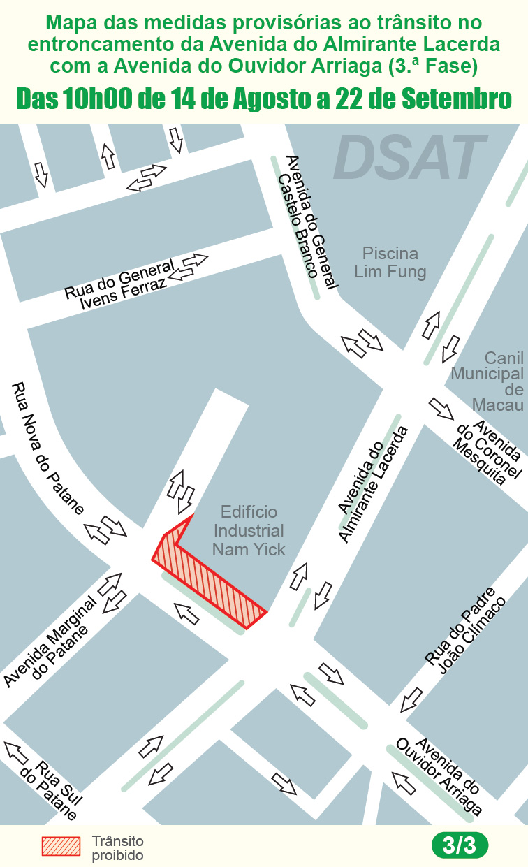 A 3.a fase terá lugar no período entre 14 de Agosto e 22 de Setembro, onde apenas o troço da Avenida do Ouvidor Arriaga junto do Edifício Industrial Nam Yick continuará vedado ao trânsito, e o cruzamento perto do referido edifício na Avenida Marginal do Patane estará sujeito a medidas de condicionamento ao trânsito.