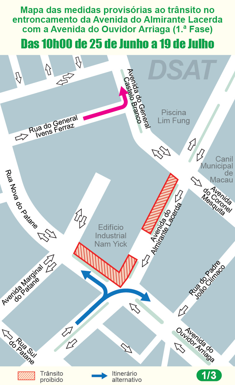A 1.a fase de obra decorrerá entre 25 de Junho e 19 de Julho,com início às 10h do primeiro dia. No troço junto do Edifício Industrial Nam Yick entre a Avenida do Ouvidor Arriaga e a Avenida do Almirante Lacerda, será proibida a circulação de veículos, à excepção de veículos para acesso ao parque de estacionamento; em paralelo, a circulação no troço da Rua do General Ivens Ferraz entre a Rua Nova do Patane e a Avenida do General Castelo Branco passará a efectuar-se em sentido único (no sentido da Rua Nova do Patane em direcção à Avenida do General Castelo Branco), o trânsito da Avenida de Horta e Costa em direcção da Avenida do Coronel Mesquita deverá contornar a Rua do Comandante João Belo ou a Estrada de Coelho do Amaral.