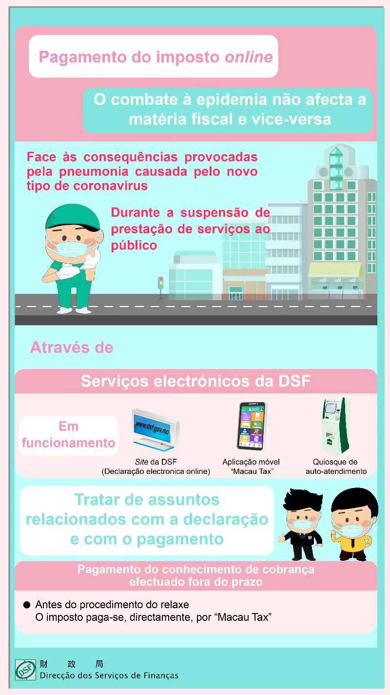 Face às consequências provocadas pela pneumonia causada pelo novo tipo de coronavírus, durante a suspensão de prestação de serviços ao público por parte das entidades públicas, os contribuintes e os pagadores do devido imposto vão continuar a conseguir tratar dos assuntos fiscais relacionados com a declaração e o pagamento através de vias sem contacto pessoal, nomeadamente, o serviço electrónico para declarações no site da Direcção dos Serviços de Finanças (DSF), a aplicação móvel, os quiosques de auto-atendimento, bem como, os serviços bancários online, por forma a garantir que o cumprimento da matéria fiscal não afecte o combate à epidemia e vice-versa.