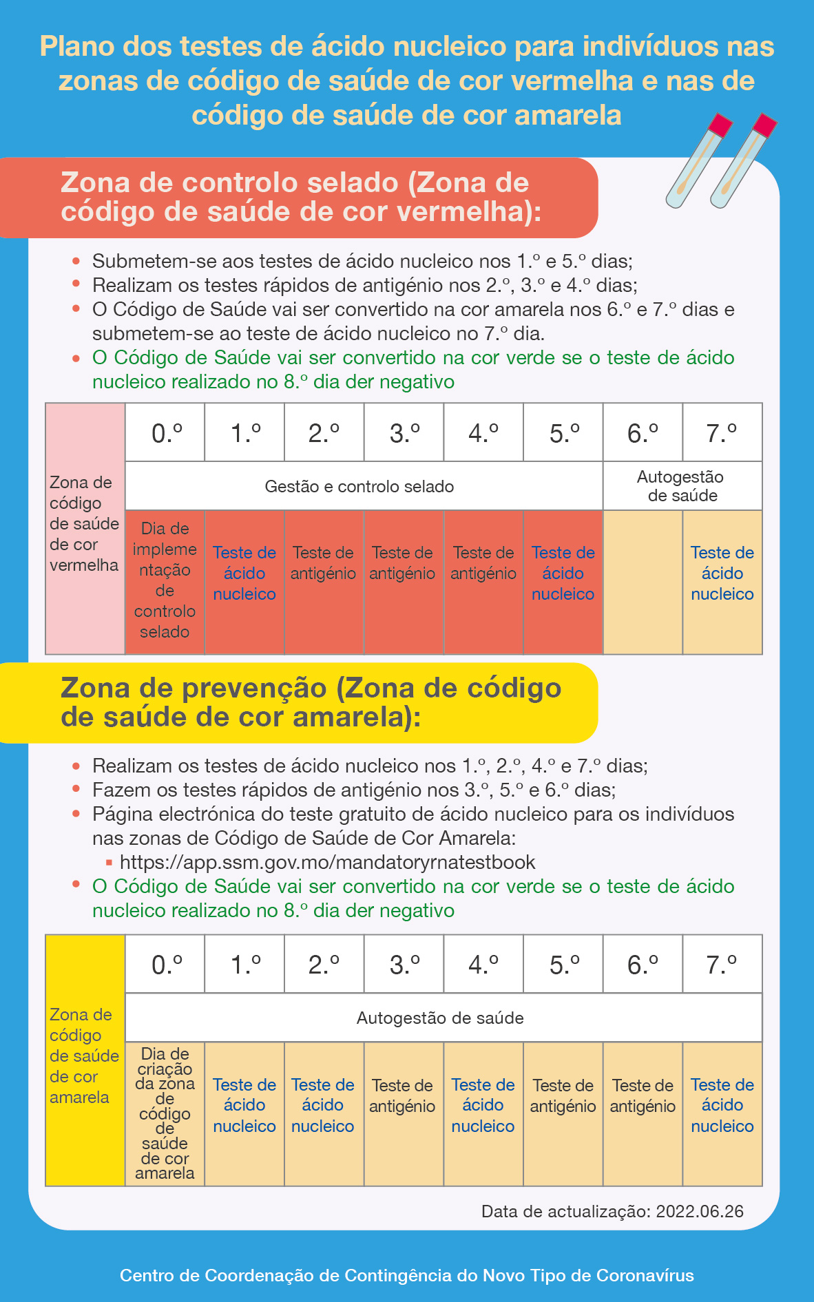 • Plano dos testes de ácido nucleico para indivíduos nas zonas de código de saúde de cor vermelha e nas de código de saúde de cor amarela