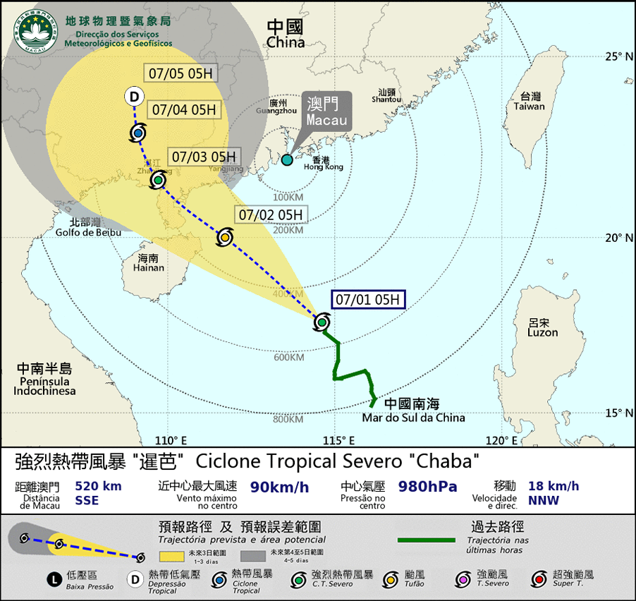 O ciclone tropical severo “Chaba” está a deslocar-se para Noroeste, em direcção às regiões entre a costa oeste de Guangdong e da Ilha de Hainan. Além disso, existem variáveis na trajectória e intensidade do “Chaba”, isto, devido à influência e desenvolvimento de outra área de baixa pressão a leste das Filipinas. Se o ciclone tropical “Chaba” adoptar uma trajectória mais para norte e mais próximo de Macau ou se intensificar perto da costa, não será descartada a hipótese de emitir um sinal de tempestade tropical mais elevado.