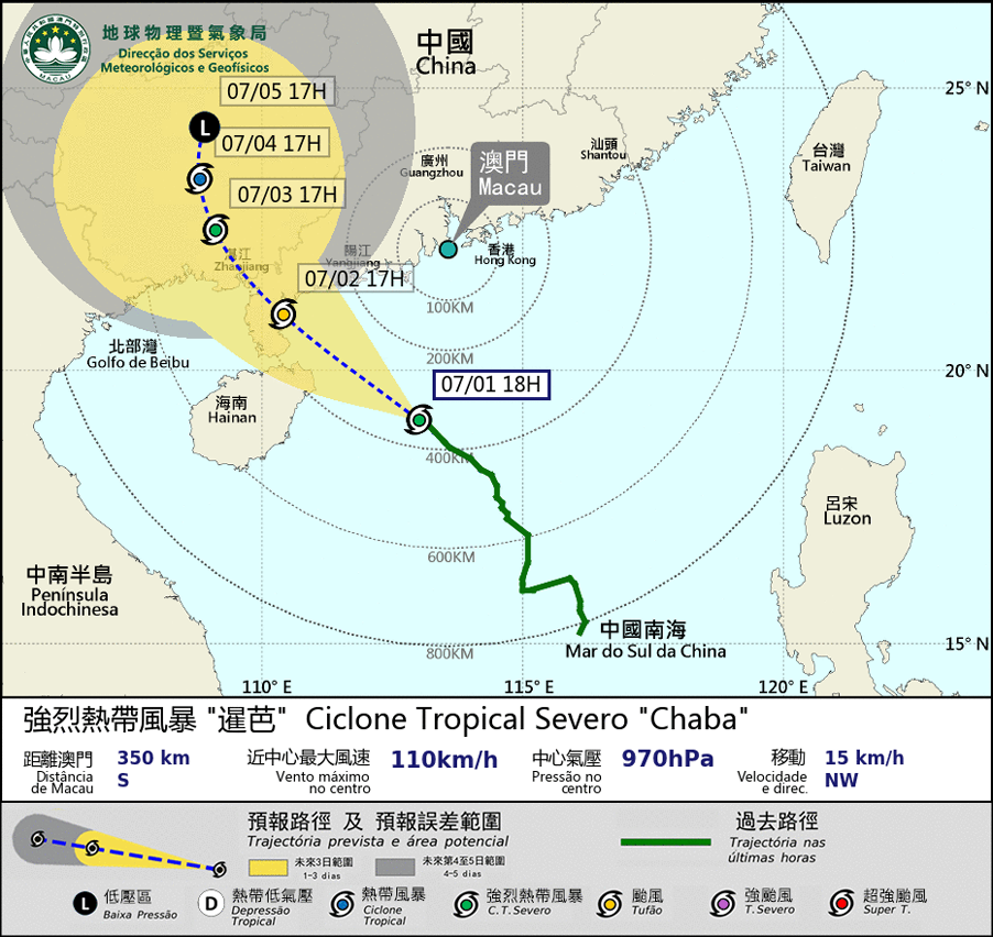 O ciclone tropical severo “Chaba” está a mover-se para Noroeste, geralmente em direcção a costa oeste de Guangdong e vai cruzar o ponto mais próximo de Macau, entre a noite do dia 1 e a madrugada do dia 2. O ciclone tropical severo "Chaba" vai intensificar para um tufão. Nesse momento, a previsão é que a intensidade do vento na região possa atingir o limite inferior do sinal n.o 8 de tempestade tropical. Consequentemente, esta Direcção vai emitir o sinal nº 8 de tempestade tropical, entre às 20:00 e 23:00 horas (dia 1).