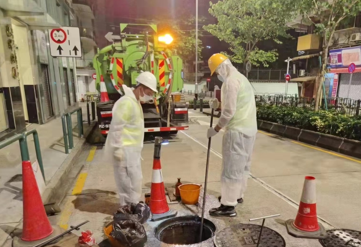 Durante o período epidémico, o IAM não deixa de intensificar constantemente os trabalhos de desentupimento dos esgotos em diversas zonas, nomeadamente verificar e desobstruir prioritariamente os esgotos nos bairros em que ocorreu inundação anteriormente, e reforçar a inspecção e limpeza das bocas dos colectores de água nas vias, de modo a manter o funcionamento normal dos esgotos. Ao mesmo tempo, o IAM continua a fiscalizar estreitamente o funcionamento das estações elevatórias de águas pluviais e de box-culverts, assim como a reforçar a limpeza das grades das estações elevatórias, a inspecção de unidades de bombas de água, de comportas eléctricas, de energia de reserva, e do funcionamento do sistema de videovigilância à distância, entre outros.
