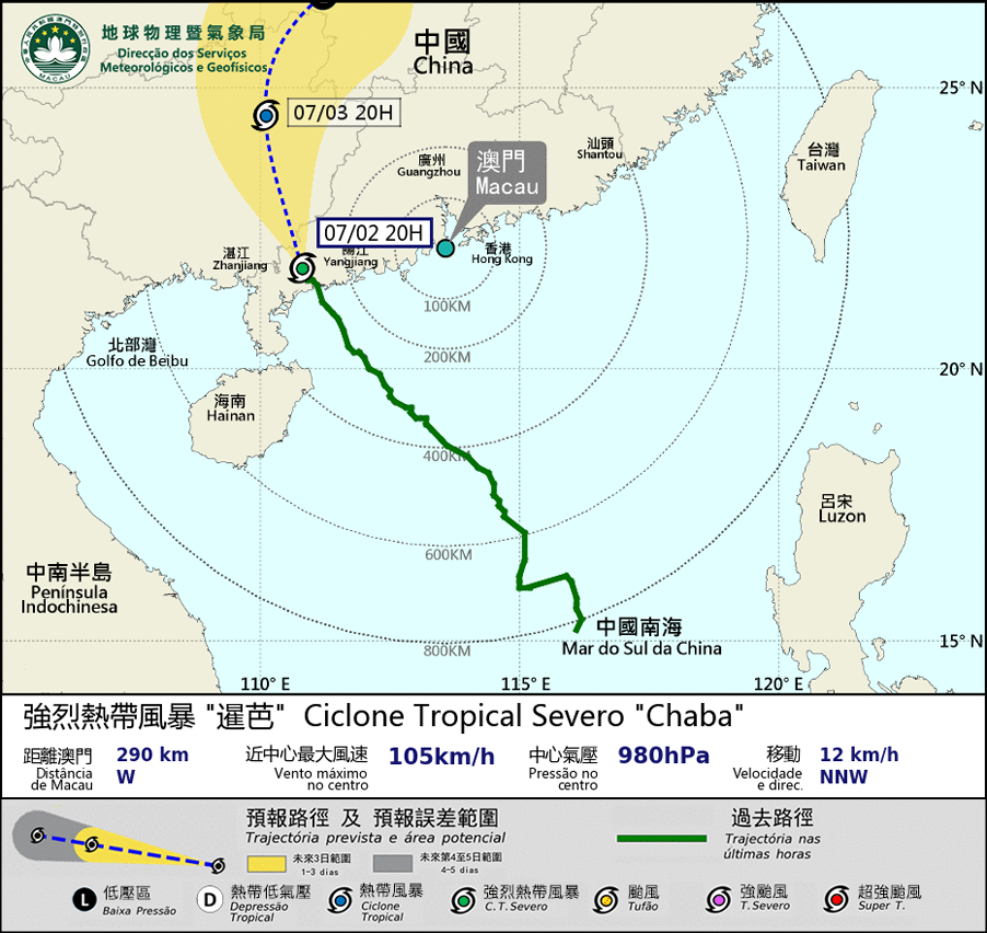 Com o enfraquecimento do “Chaba” e o afastamento de Macau, os ventos na região enfraqueceram. Consequentemente, esta Direcção foi emitido o sinal n.o 3 às 20:30 horas. Devido à influência da circulação relacionada com o "Chaba", os ventos fortes vão continuar a soprar sobre uma vasta área de Macau, entre a noite e a manhã de amanhã. O tempo continua instável, havendo os aguaceiros fortes e trovoadas. O vento pode atingir aos níveis 6 a 7 e também não pode ser descartada a situação de ocorrência de chuva intensa. Aconselha-se à população que presta atenção às condições atmosféricas e siga as informações meteorológicas mais recentes.