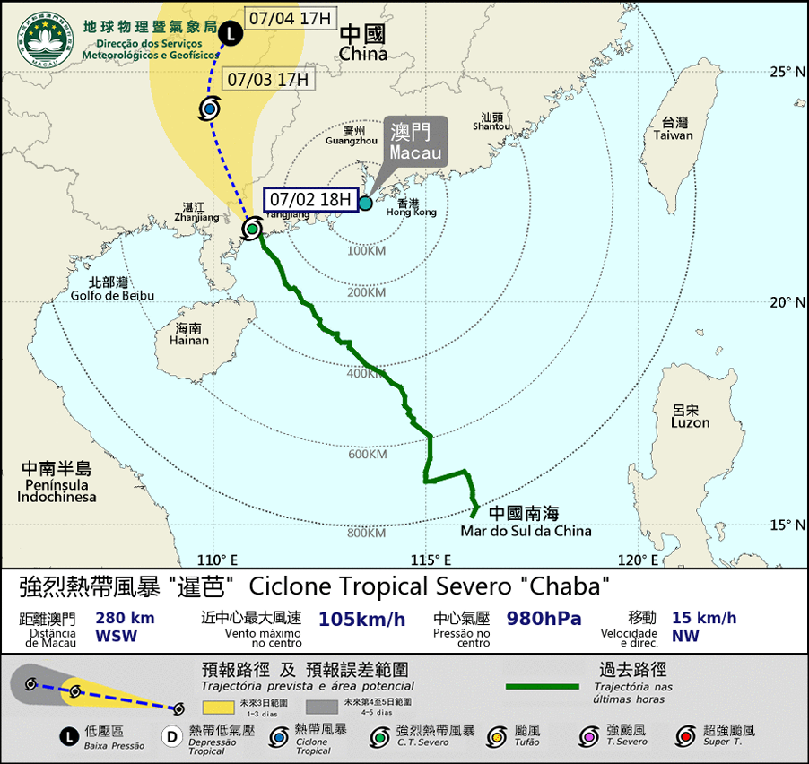 O “Chaba” foi reduzido para ciclone tropical severo. Com a chegada a terra do “Chaba” e a deslocação para interior do continente, os ventos na região vão enfraquecer. Consequentemente, entre as 19:00 e as 22:00 horas, esta Direcção vai considerar emitir o sinal n.o 3 de tempestade tropical conforme a situação. No entanto, sob a influência da circulação do “Chaba”, hoje e amanhã, vão continuar os aguaceiros fortes e trovoadas. O vento na região pode eventualmente soprar de leste a sueste, aos níveis de 5 – 6 com rajadas.