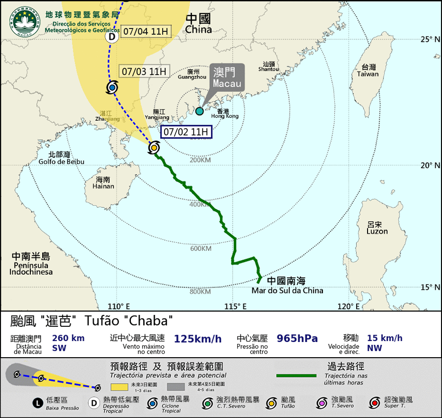 O tufão “Chaba” está a mover-se, lentamente, para Noroeste e durante a tarde espera-se que o tufão atinja terra entre Zhanjiang e Maoming. Visto que a trajectória tomada pelo "Chaba", está a revelar-se mais para norte do que antecipado, e a intensidade deste sistema, ainda vai aumentar ligeiramente antes de atingir terra, o seu impacto para Macau vai continuar a manter-se durante a tarde. Portanto, o sinal n.o 8 vai continuar em vigor durante a tarde. Sob a influência das bandas de chuva do “Chaba” os aguaceiros fortes e trovoadas vão continuar durante o dia. O vento na região intensificou-se, significativamente, de leste a sueste, aos níveis de 8 – 9 com rajadas.