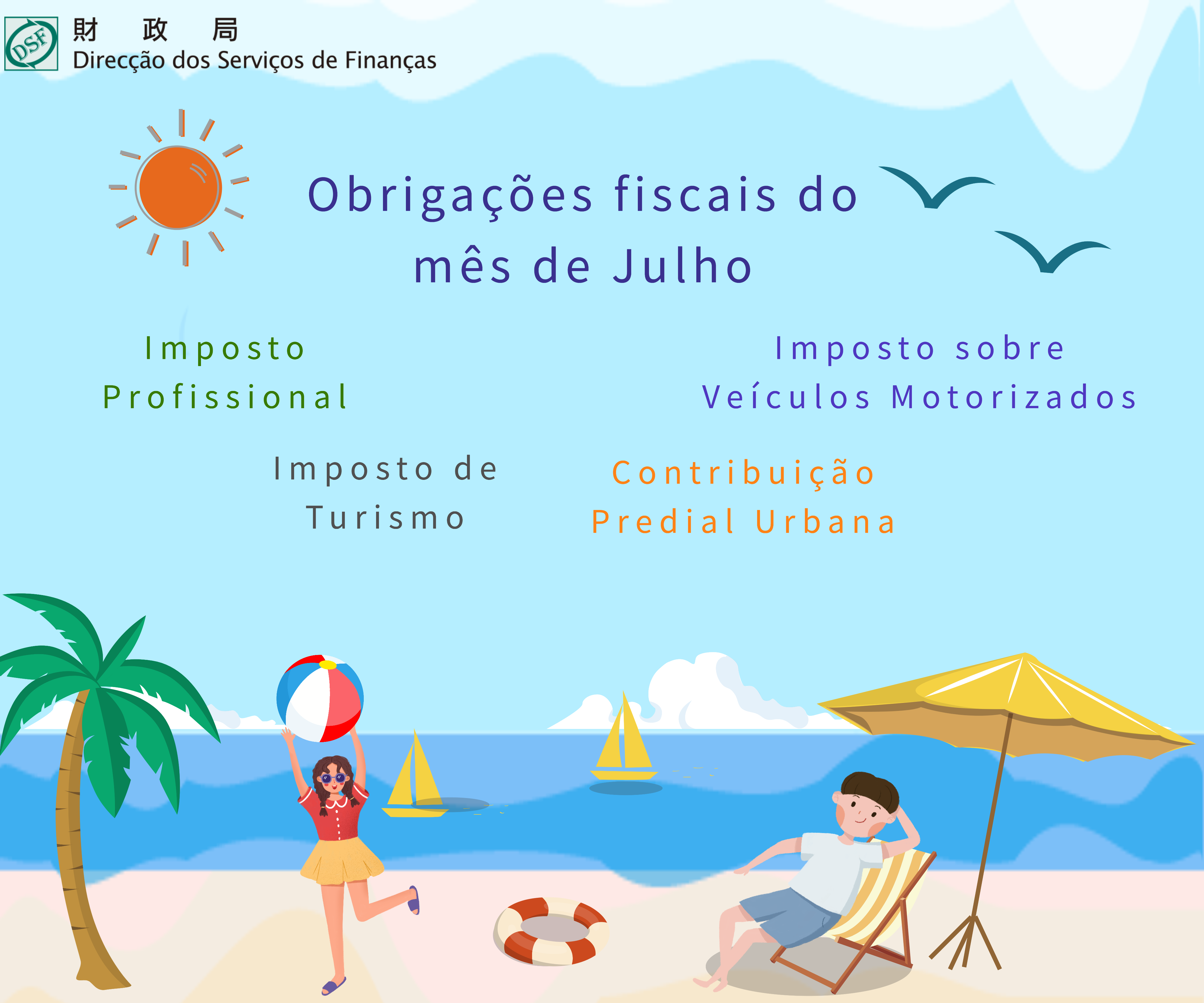 Entrega pelas entidades patronais, nas Recebedorias da DSF, do Edifício Long Cheng, do Centro de Serviços da RAEM ou do Centro de Serviços da RAEM das Ilhas, das importâncias deduzidas nas remunerações abonadas aos seus assalariados ou empregados, efectuadas no trimestre imediatamente anterior (durante os meses de Abril, Maio e Junho), mediante a Guia modelo M/B. (art.º 32.º, n.ºs 4 e 6 da Lei n.º 2/78/M, de 25 de Fevereiro, republicada integralmente pelo Despacho do Chefe do Executivo n.º 267/2003) |