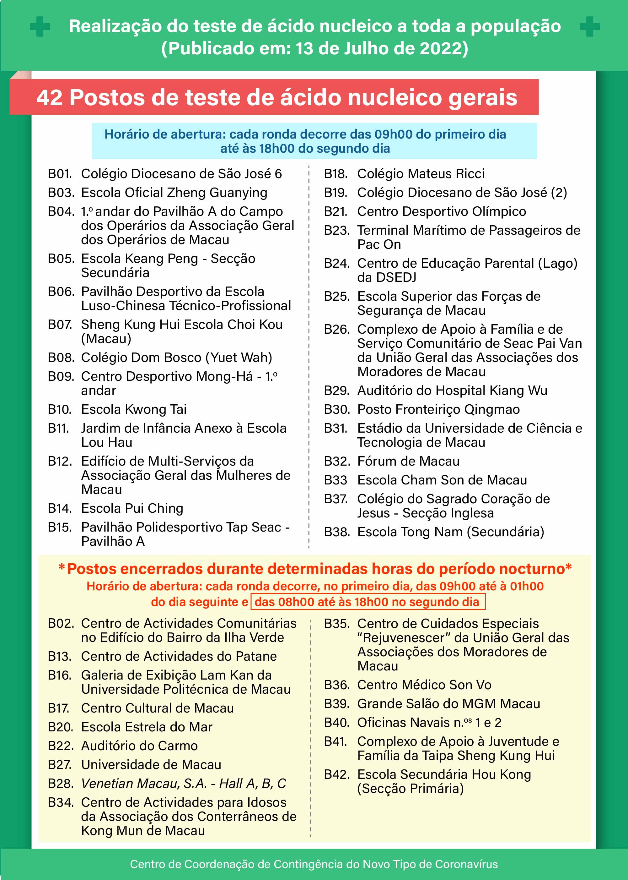 O horário de abertura de 4 postos gerais, nomeadamente, o B20 Escola Estrela do Mar, B28 Venetian Macau, S.A., salões A, B e C, B35 Centro de Cuidados Especiais “Rejuvenescer” da União Geral das Associações dos Moradores de Macau e B39 Grande Salão do MGM Macau, juntamente com outros 11 postos gerais que funcionaram apenas durante o dia e em alguns períodos nocturnos na última ronda (vide a tabela), serão ajustados para o período das 09h00 do dia 14 de Julho até à 01h00 do dia 15 de Julho e, das 08h00 às 18h00 do dia 15 de Julho. O horário de abertura dos restantes postos gerais manter-se-á inalterado.