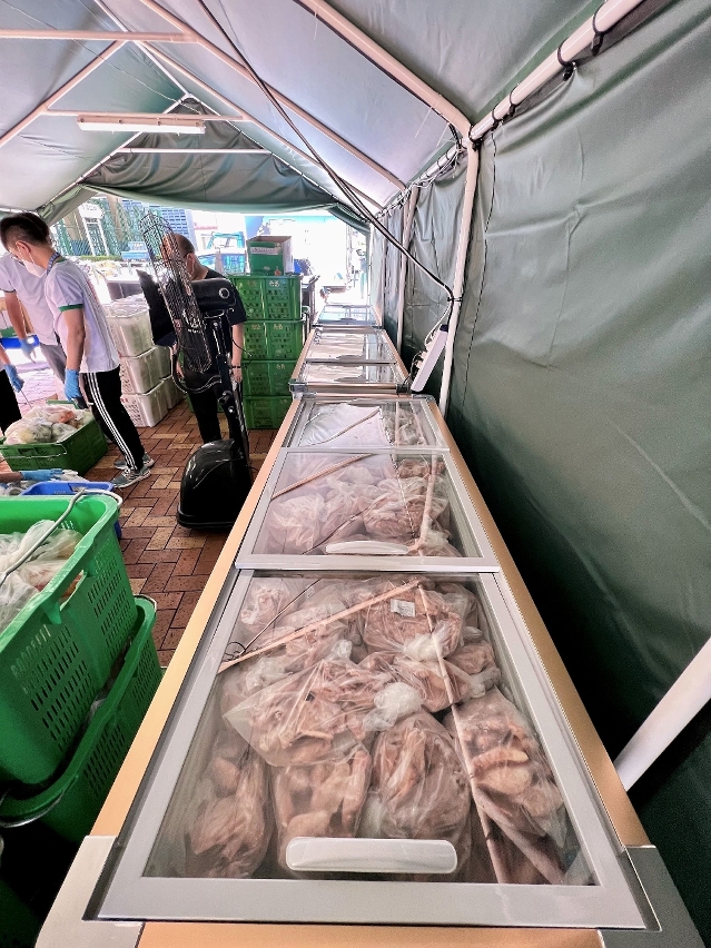Com vista a garantir a segurança higiénica na distribuição dos pacotes de legumes e carnes congeladas, em cada posto de apoio da zona de código vermelho, estão montadas tendas equipadas com frigoríficos para armazenamento temporário de carnes congeladas, cuja temperatura cumpre os requisitos de segurança alimentar. Ao mesmo tempo, os pacotes de carnes congeladas são aprovados na inspecção sanitária e posteriormente distribuídos em veículos de congelação pelos fornecedores para diferentes zonas de código vermelho, onde são armazenados nos frigoríficos de imediato. Os trabalhadores, de acordo com os requisitos de segurança alimentar e higiénica, levantam as carnes congeladas dos frigoríficos apenas antes da entrada nos edifícios de código vermelho para a sua distribuição, de modo a minimizar o tempo de transporte, de modo a evitar o descongelamento.