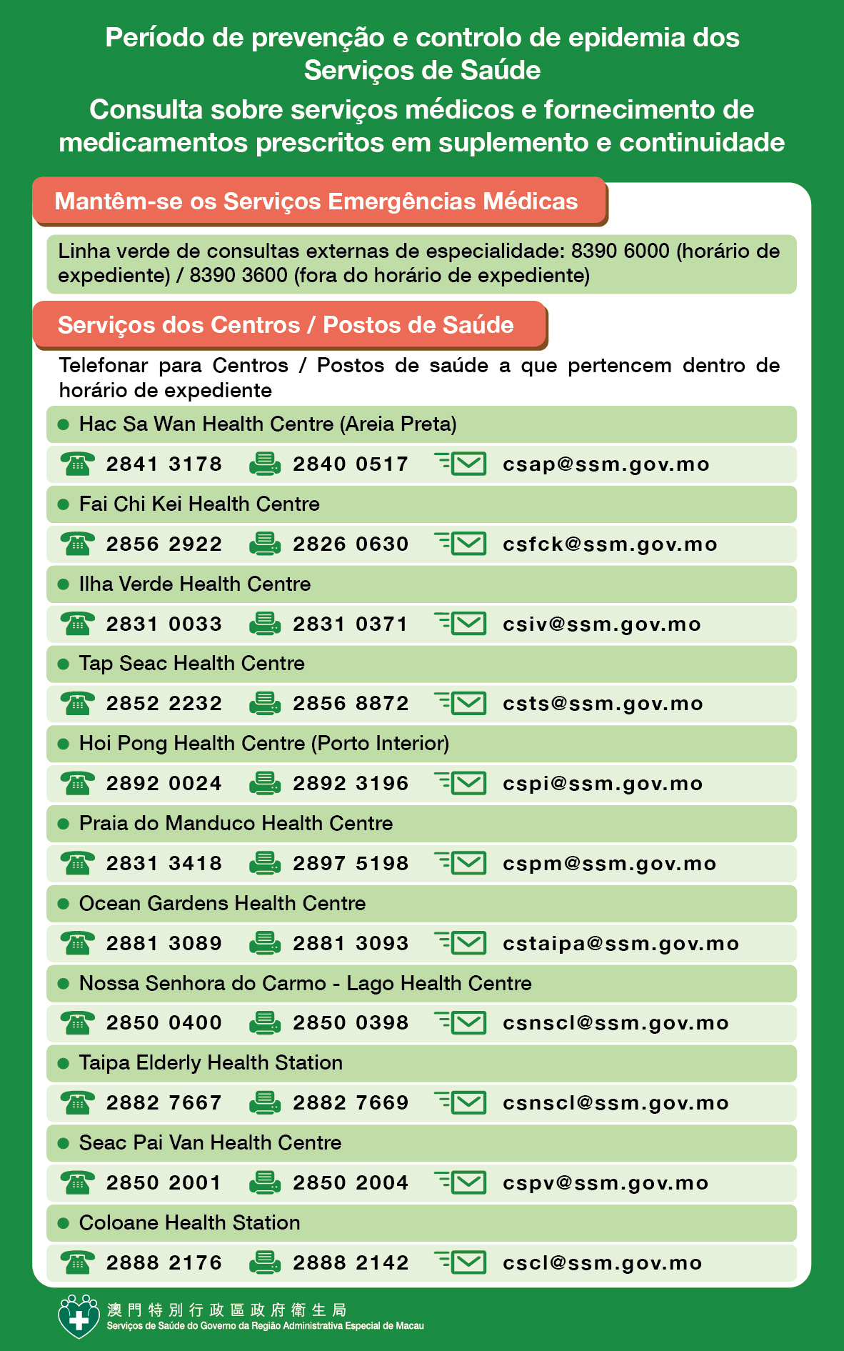 Durante o período de prevenção e controlo da epidemia, os serviços médicos do Centro Hospitalar Conde de São Januário, Centros/Postos de Saúde, emissão de 2ª. Via e renovação do levantamento de medicamentos são disponibilizados da seguinte forma: