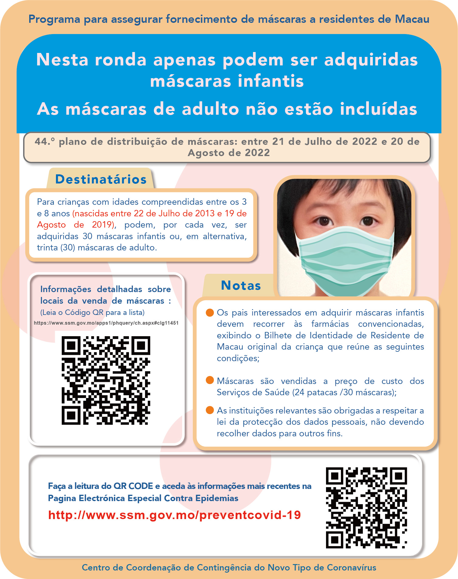 O Centro de Coordenação de Coordenação de Contingência do Novo Tipo de Coronavírus informa que amanhã (21 de Julho), terá início o 44.º Plano de fornecimento de máscaras destinado aos residentes de Macau.