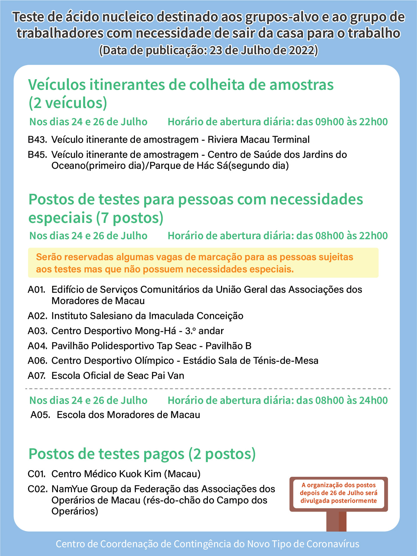 - O horário de funcionamento de sete (7) postos específicos destinados a pessoas com necessidades especiais é das 08h00 às 22h00, entre os dias 24 e 26 de Julho, dos quais o horário de funcionamento do posto de testes de ácido nucleico na Escola dos Moradores de Macau, será prolongado para as 24h00.