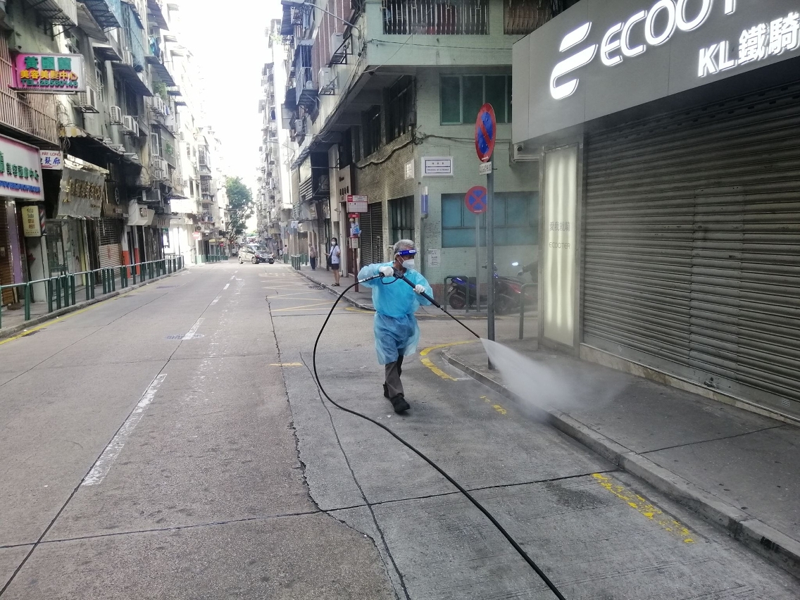 Desde o início do actual surto de casos positivos, o IAM, de acordo com as orientações antiepidémicas emitidas pelos Serviços de Saúde, tem coordenado constantemente com a CSR Macau para destacar mais pessoal e veículos de limpeza de ruas para todos os bairros de Macau, limpando as vias pedonais e rodoviárias com pistola de água de alta pressão e alvejante diluído. Simultaneamente, duplicou o números de trabalhadores enviados para proceder à limpeza, com alvejante diluído, dos corrimãos das escadas rolantes, abrigos para paragens de autocarros, placas indicadoras das paragens, parquímetros e outras instalações públicas, e à pulverização com líquido desinfectante das bocas de esgoto públicas, corrimãos e vedações das vias pedonais, a fim de garantir a higiene e a limpeza ambiental dos bairros.