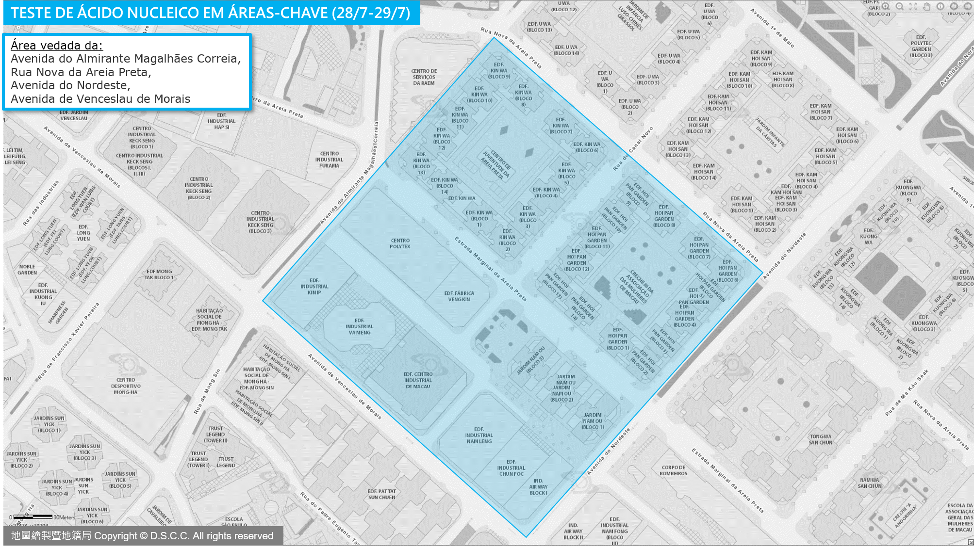 O Centro de Coordenação de Contingência do Novo Tipo de Coronavírus anunciou que, para detectar as pessoas eventualmente infectadas com a COVID-19 na comunidade local, por forma a receber o tratamento médico precoce, as áreas onde recentemente se têm concentrado mais casos positivos da COVID-19, serão classificadas como Zonas-Alvo; as pessoas provenientes das Zonas-Alvo, devem ser submetidas a testes de ácido nucleico, no dia 28 de Julho (Quinta-feira) ou no dia 29 de Julho (Sexta-feira). Por sua vez, as pessoas portadoras com código amarelo e aqueles que participaram no teste de ácido nucleico, para grupos-alvo/grupo de trabalhadores com necessidades de sair da casa para o trabalho, no mesmo dia não precisarão de repetir o teste de ácido nucleico, dado que os seus resultados de teste ácido nucleico, também são incluídos no número de vezes de testes exigidos, pelas autoridades de saúde.