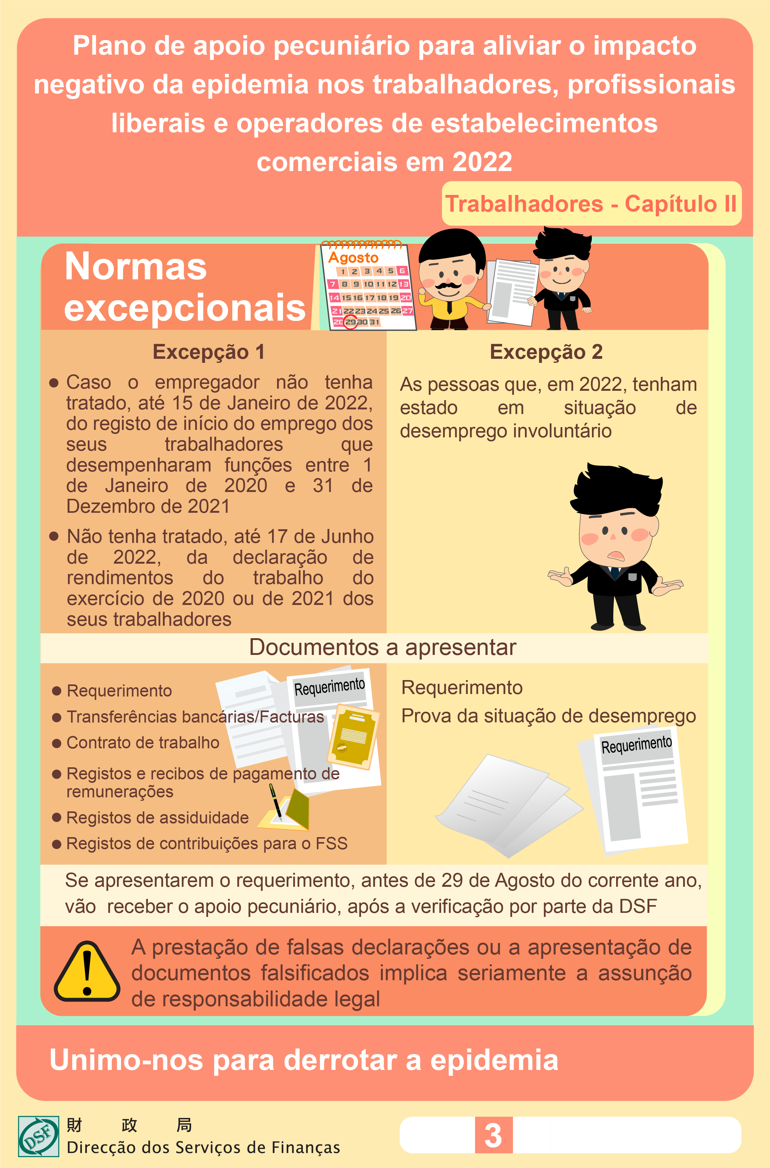 Além disso, aos residentes de Macau que entre 1 de Janeiro e 30 de Julho de 2022 tenham entrado em situação de desemprego involuntário, após verificação, por parte da DSF, dos elementos informativos e dos devidos requisitos que lhes dizem respeito, é também atribuído o respectivo apoio pecuniário, mediante requerimento e apresentação de prova relativa ao desemprego.