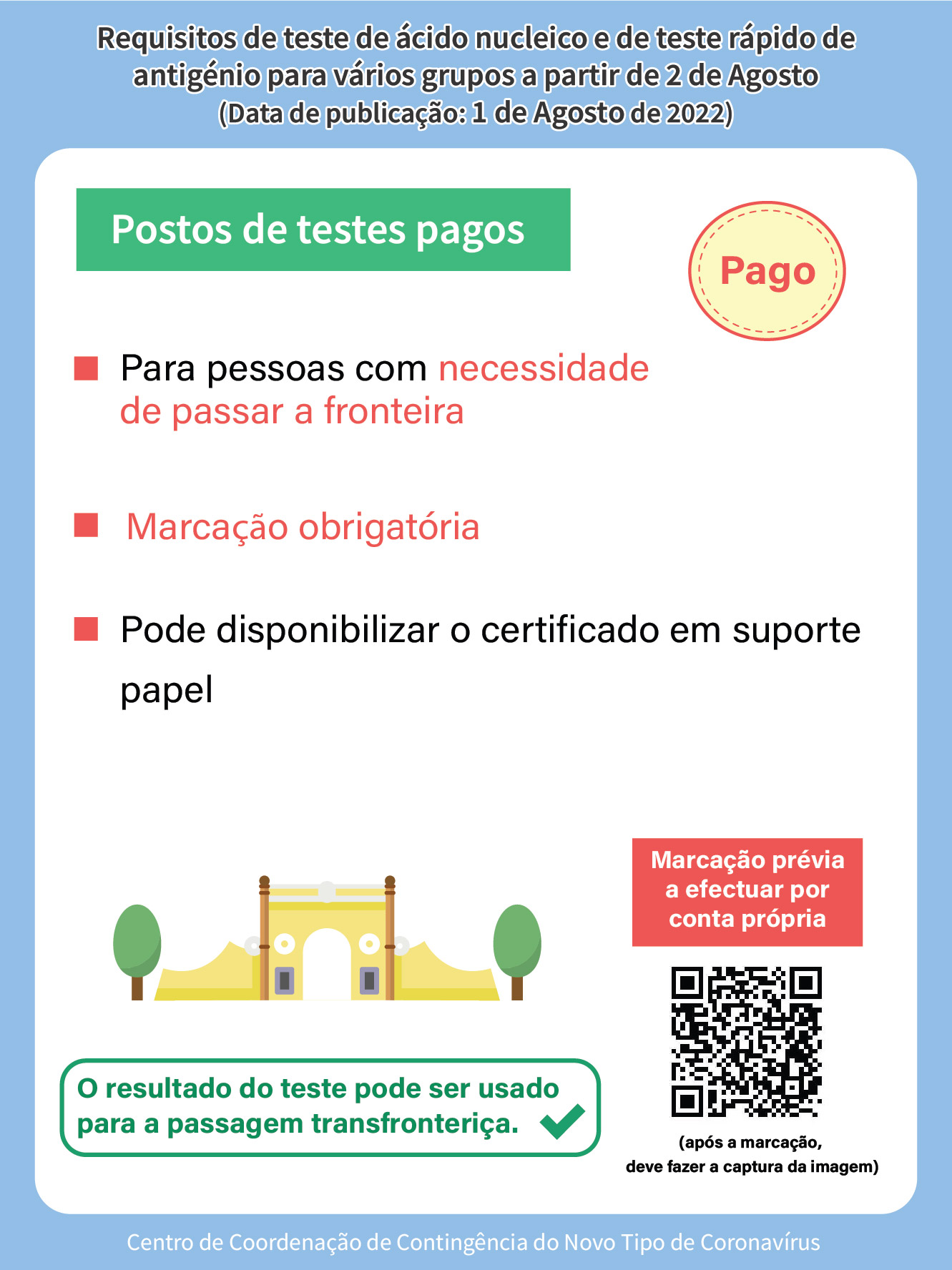 O Centro de Coordenação de Contingência do Novo Tipo de Coronavírus informa que, após a análise de risco, no dia 2 de Agosto (terça-feira), os grupos-chave e o grupo de trabalhadores, com necessidade de saírem de casa para o trabalho, têm de realizar os seguintes testes, a saber: