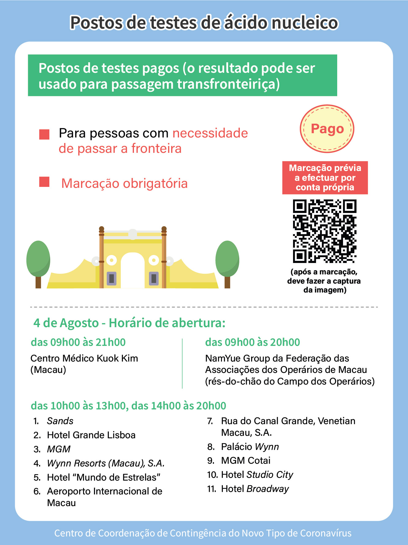 I. Postos de teste de ácido nucleico gratuitos (não servem para efeitos de passagem fronteiriça) – Horário de funcionamento: 08h00 às 22h00.
