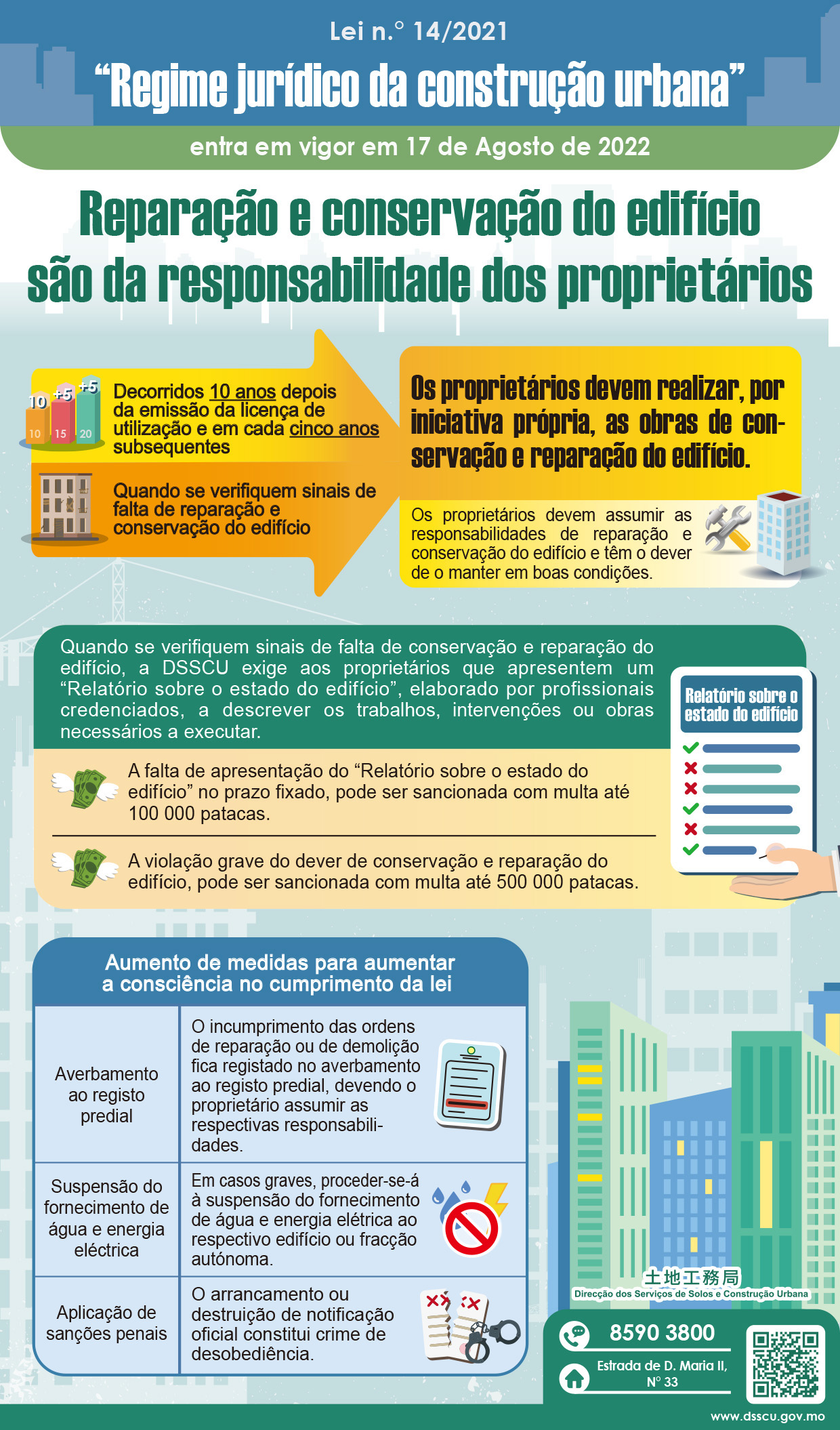 A conservação e reparação periódica de edifícios constituem garantias para a segurança dos mesmos e são também uma responsabilidade dos proprietários. A fim de reforçar a consciência dos proprietários para a responsabilidade de conservarem e repararem os edifícios, o novo regime estipula que decorridos 10 anos após a emissão da licença de utilização e em cada cinco anos subsequentes, os proprietários devem realizar obras de reparação e conservação nos seus edifícios, no sentido de os manter sempre em boas condições de utilização. Para reforçar a fiscalização dos edifícios, caso a DSSCU verifique sinais de falta de conservação do edifício, exige oficiosamente aos proprietários que apresentem um “Relatório sobre o estado do edifício” elaborado por profissionais credenciados, onde conste a descrição das medidas de conservação e reparação ou obras necessárias a executar. No caso de incumprimento da execução dos trabalhos previstos na respectiva notificação, os proprietários ficarão sujeitos à aplicação de sanções administrativas.