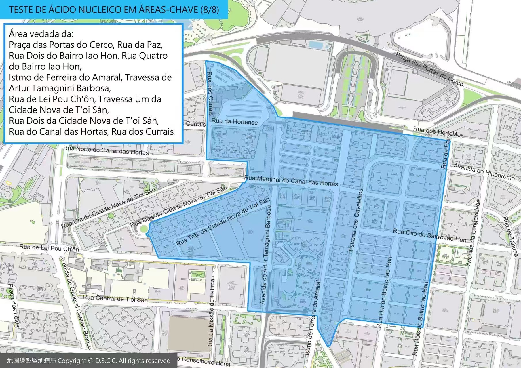 - As pessoas que morem, trabalhem nas zonas delimitadas pela Praça das Portas do Cerco, Rua da Paz, Rua Dois do Bairro Iao Hon, Rua Quatro do Bairro Iao Hon, Istmo de Ferreira do Amaral, Travessa de Artur Tamagnini Barbosa, Rua de Lei Pou Ch'ôn, Travessa Um da Cidade Nova de T'oi Sán, Rua Dois da Cidade, Rua do Canal das Hortas e Rua dos Currais.