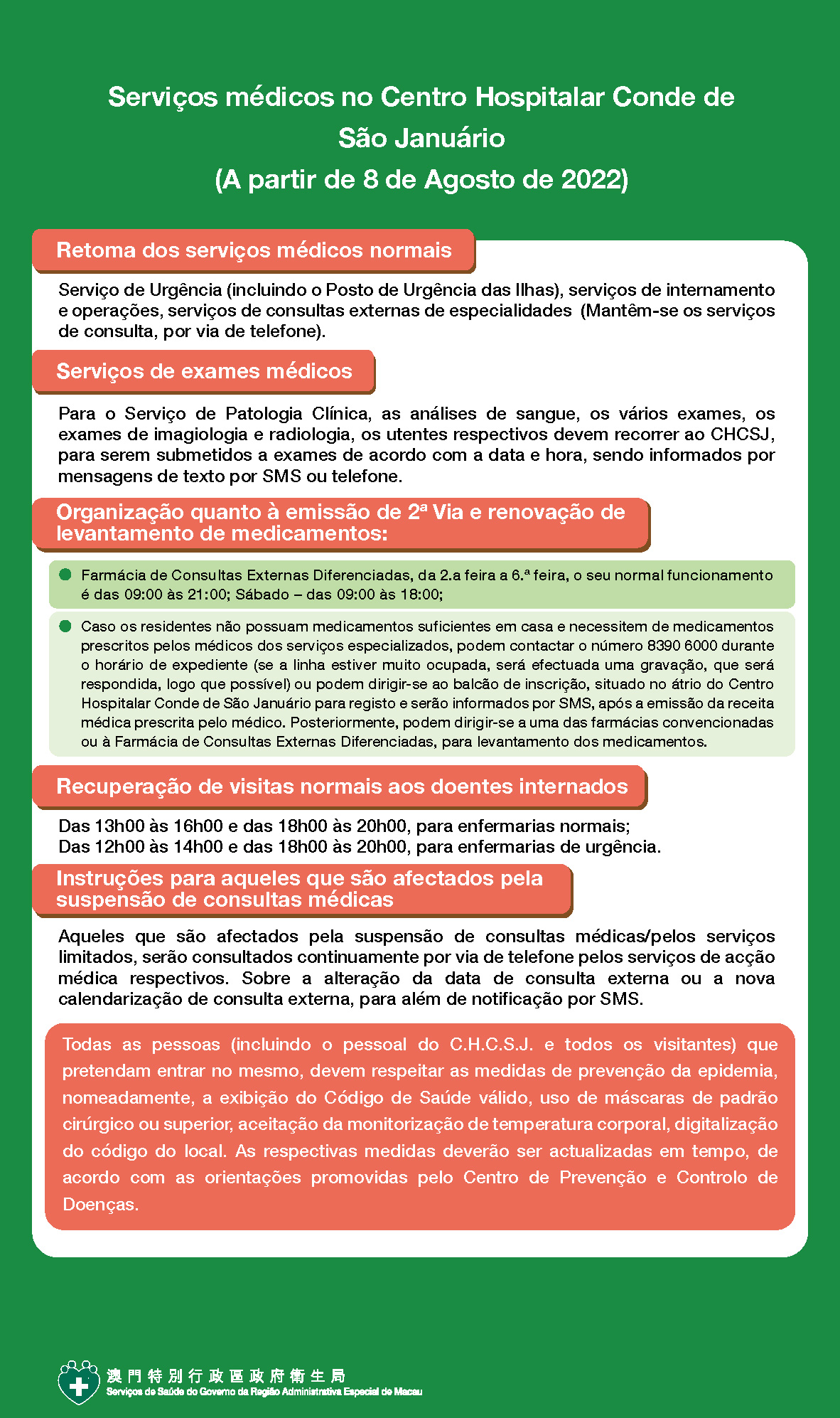 A partir de 8 de Agosto, os serviços médicos do Centro Hospitalar Conde de São Januário, Centros/Postos de Saúde, emissão de 2ª. Via e renovação do levantamento de medicamentos são disponibilizados da seguinte forma: