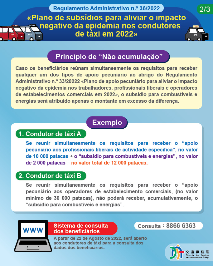 A fim de atenuar o impacto negativo da epidemia no sector de táxi, o Governo da RAEM anunciou, hoje (dia 8), o lançamento do «Plano de subsídios para aliviar o impacto negativo da epidemia nos condutores de táxi em 2022». Aos condutores de táxis que reúnem os requisitos é atribuído, de uma só vez, o subsídio para combustíveis e energias, no montante máximo de 12 000 patacas. No entanto, há que ter em atenção que, caso os beneficiários reúnam simultaneamente os requisitos para receber um dos tipos de apoio pecuniário ao abrigo do Regulamento Administrativo n.º 33/20222 «Plano de apoio pecuniário para aliviar o impacto negativo da epidemia nos trabalhadores, profissionais liberais e operadores de estabelecimentos comerciais em 2022», serão atribuído apenas o montante em excesso da diferença entre o subsídio para combustíveis e energias, ou seja, no montante de 2 000 patacas.
