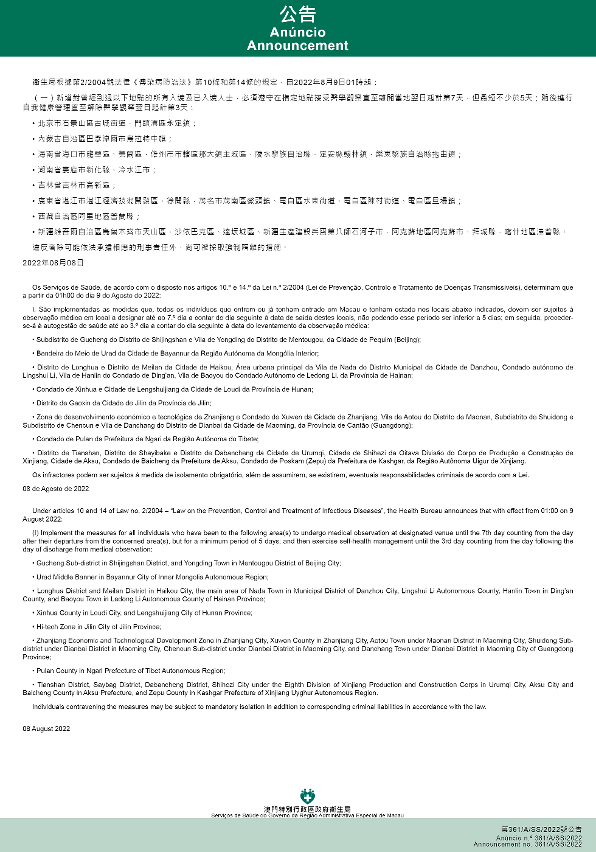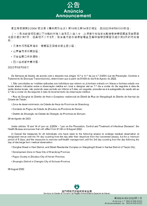 Tendo em consideração a evolução epidemiológica mais actualizada no Interior da China, os Serviços de Saúde, de acordo com o disposto nos artigos 10.º e 14.º da Lei n.º 2/2004 (Lei de Prevenção, Controlo e Tratamento de Doenças Transmissíveis), determinam que a partir da 01h00 do dia 9 de Agosto de 2022, são implementadas ou canceladas as medidas antiepidémicas para quem tenha estado em diversas áreas do Interior da China: