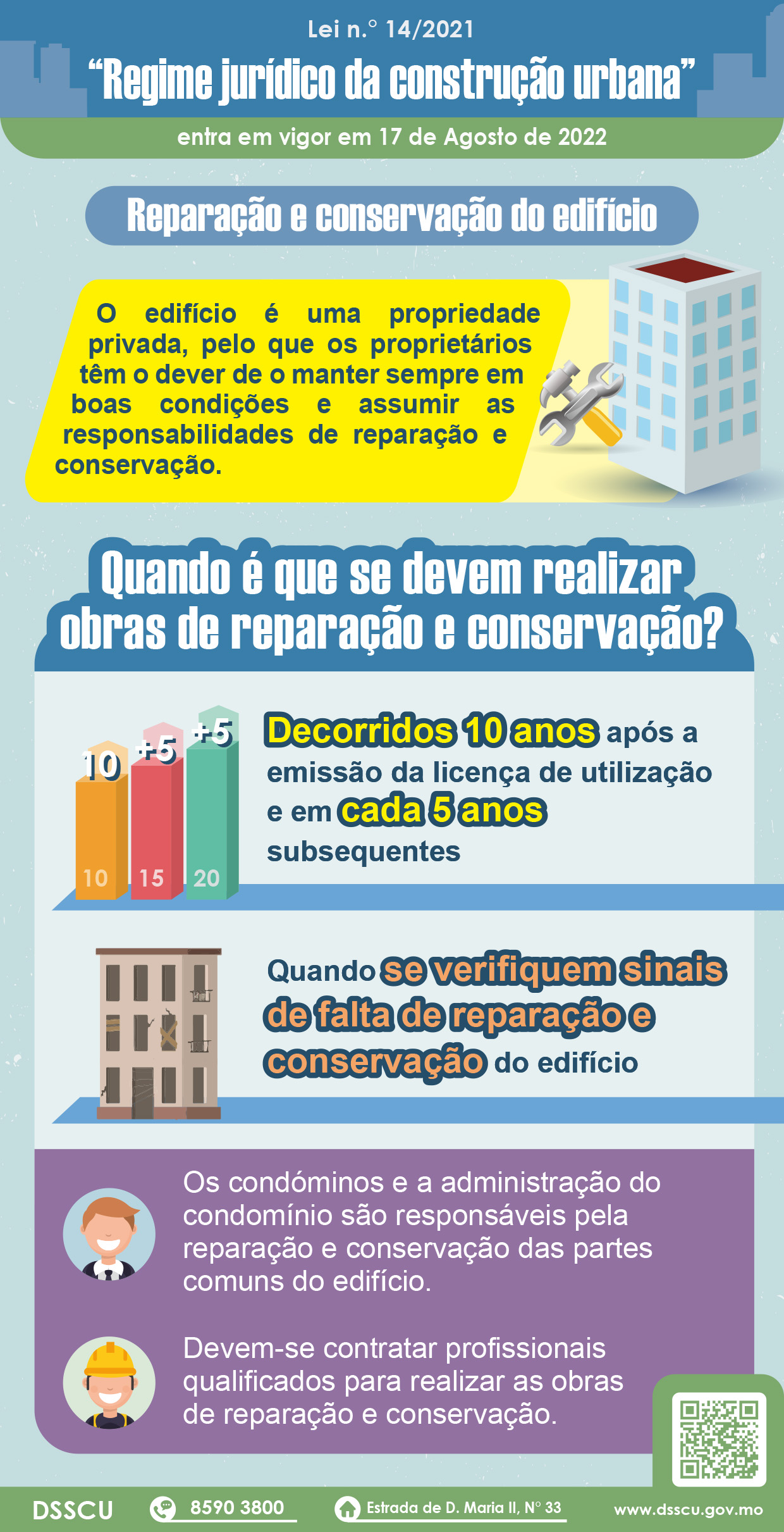 O “Regime jurídico da construção urbana” define claramente que os proprietários devem assumir a responsabilidade e o dever de reparar e conservar o edifício, estipulando ainda que decorridos 10 anos após a emissão da licença de utilização e em cada cinco anos subsequentes, devem proceder à reparação e conservação do mesmo, no sentido de o manter em boas condições. Caso se verifiquem sinais de falta de conservação do edifício, nomeadamente problemas de segurança e de salubridade, a Direcção dos Serviços de Solos e Construção Urbana (DSSCU) vai exigir aos proprietários que acompanhem o problema, incluindo a entrega de um “Relatório sobre o estado do edifício” elaborado por profissionais credenciados e a execução das devidas obras de reparação e conservação. Em caso de violação grave do dever de conservação e reparação, os proprietários ficam sujeitos à aplicação de multa.