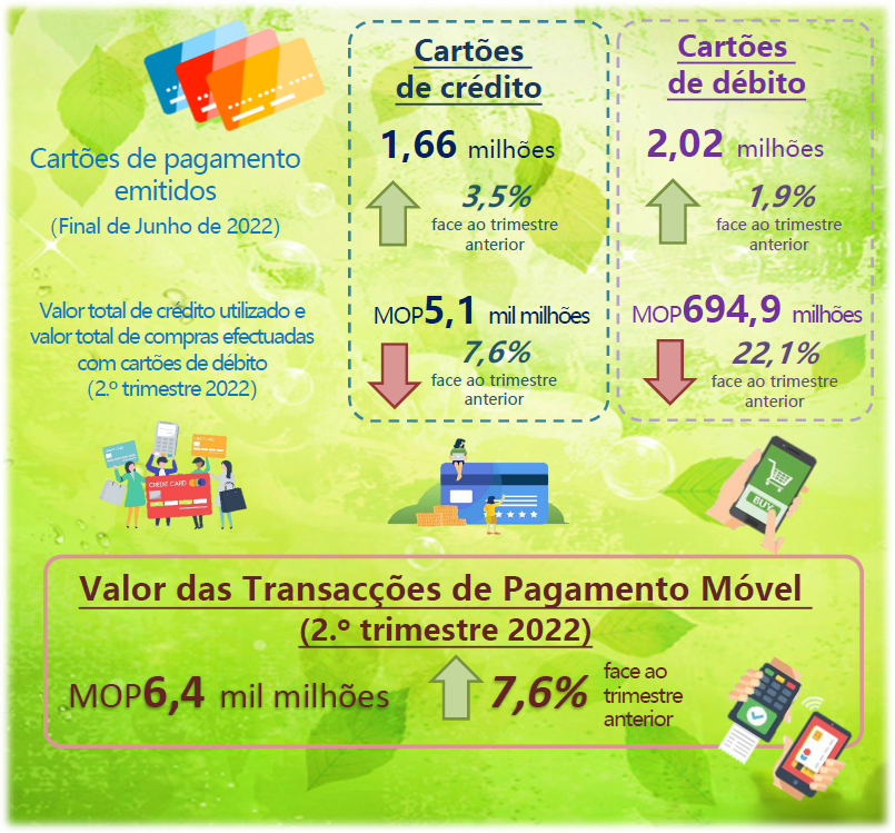 No segundo trimestre de 2022, o crédito utilizado no período atingiu MOP5,1 mil milhões, o que representou uma queda trimestral de 7,6%. O adiantamento de numerário atingiu MOP139,3 milhões, correspondendo a 2,8% do total do crédito utilizado no período. O número de transacções realizadas com cartões de crédito totalizou 8,4 milhões, o que representou uma queda trimestral de 3,9%. O montante do reembolso, incluindo os juros e despesas, foi de MOP5,4 mil milhões, o que representou uma diminuição de 6,5% relativamente ao trimestre anterior. Por enquanto, o número de transacções realizadas com cartões de débito (não incluindo o levantamento de numerário) totalizou 347,7 mil, o que representou uma diminuição trimestral de 16,4%. O valor total de compras efectuadas com cartões de débito atingiu MOP694,9 milhões, correspondendo a uma queda de 22,1% relativamente ao trimestre anterior.