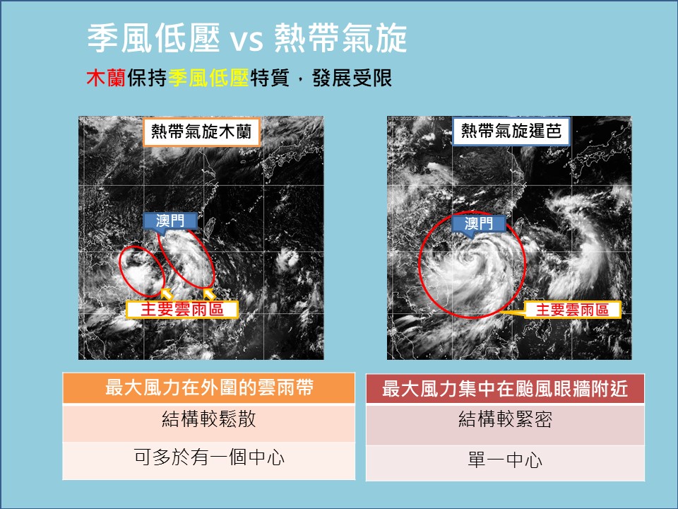 O "Mulan" foi um ciclone tropical de natureza semelhante a “monsoon depression”. Embora a intensidade do vento do sistema tenha aumentado, a sua estrutura foi sempre solta e manteve sempre características de “monsoon depression” (Figura 2). Ao mesmo tempo, de acordo com os dados observados, a distribuição do vento de "Mulan" foi diferente de outros ciclones tropicais comuns. A intensidade do vento no centro do sistema foi fraca e o campo de vento forte estava localizado na sua periferia. O campo de vento forte do nível 7-8 da escala “Beaufort” ficou quase sempre do lado nordeste da periferia de "Mulan". (Figura 3)