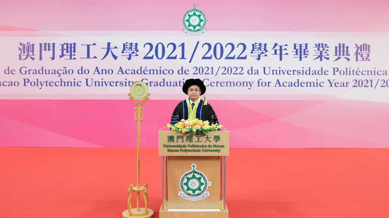 Na Cerimónia, o Reitor da Universidade Politécnica de Macau, Prof. Im Sio Kei agradeceu ao Chefe do Executivo da RAEM, às entidades do Governo Central na RAEM, à Secretária para os Assuntos Sociais e Cultura, ao Presidente e aos membros do Conselho Geral da UPM e aos diversos sectores da sociedade pelos apoios prestados. Com o apoio do País e do Governo da RAEM, a UPM deu um grande passo em frente. No âmbito de ensino, referiu, a maioria dos cursos conferentes de grau académico já obteve a acreditação académica por autoridades internacionais, de modo a valorizar os cursos e a prestar aos alunos da UPM uma experiência excelente tanto na aprendizagem como no ensino. No campo da investigação científica, o estabelecimento na UPM do Centro de Investigação de Engenharia em Tecnologia Aplicada à Tradução Automática e Inteligência Artificial, Ministério da Educação e do UPM-Centro de Supercomputação Inteligente proporciona vantagens como plataformas de inovação favoráveis a um desenvolvimento diversificado da inovação. No que diz respeito ao serviço social, o sistema de tradução automática chinês-português desenvolvido na UPM fornece às entidades públicas e à sociedade uma série de produtos de alta eficiência e de qualidade, tendo atraído utentes, não apenas locais mas também do Interior da China e dos Países de Língua Português. No tocante ao desenvolvimento dos alunos da UPM, os desempenhos foram excelentes, em várias áreas, com os prémios e resultados distintos obtidos em competições a nível regional e mundial; e, para além disso, vários alunos de pós-graduação da UPM foram admitidos para apresentarem comunicações em conferências internacionais e publicarem os seus artigos excelentes nos principais periódicos académicos, e também receberam prémios e distinções relevantes. A Universidade Politécnica de Macau vai persistir neste caminho, esforçando-se por responder às necessidades do desenvolvimento socioeconómico de Macau, ajustando o seu crescimento ao desenvolvimento das quatro indústrias pilares de Macau, nomeadamente as indústrias de Saúde, Finanças, Ciências e Tecnologias e de Base Cultural, no intuito de contribuir para as funções de Macau como a plataforma de serviços para a China e os Países Lusófonos, e formando mais quadros qualificados para Macau e o País. O Prof. Im Sio Kei deixou o desejo de que os graduados possam ter uma visão mundial e manter a pátria no coração, agarrar bem as oportunidades dadas pela Era actual e ter a coragem de desafiar e inovar; bem como que continuem a manter o espírito da comunidade da UPM, designadamente o optimismo, a persistência e a coragem de inovar e experimentar, até conseguirem as “maravilhas” após a constante exploração.
