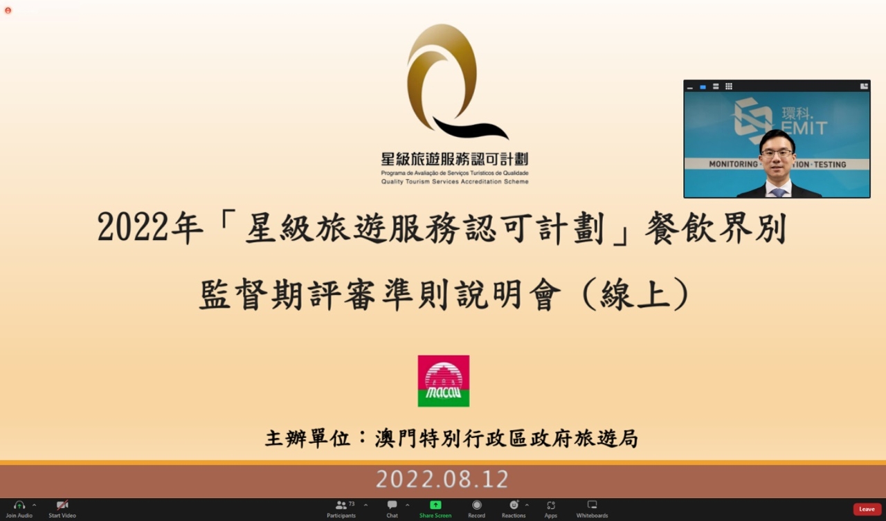 A Direcção dos Serviços de Turismo (DST) realizou hoje (dia 12) uma sessão de esclarecimento online para o sector da restauração, no âmbito do “Programa de Avaliação de Serviços Turísticos de Qualidade” de 2022, para apresentar aos estabelecimentos premiados os critérios de avaliação do período de supervisão do programa e detalhes dos trabalhos relacionados.