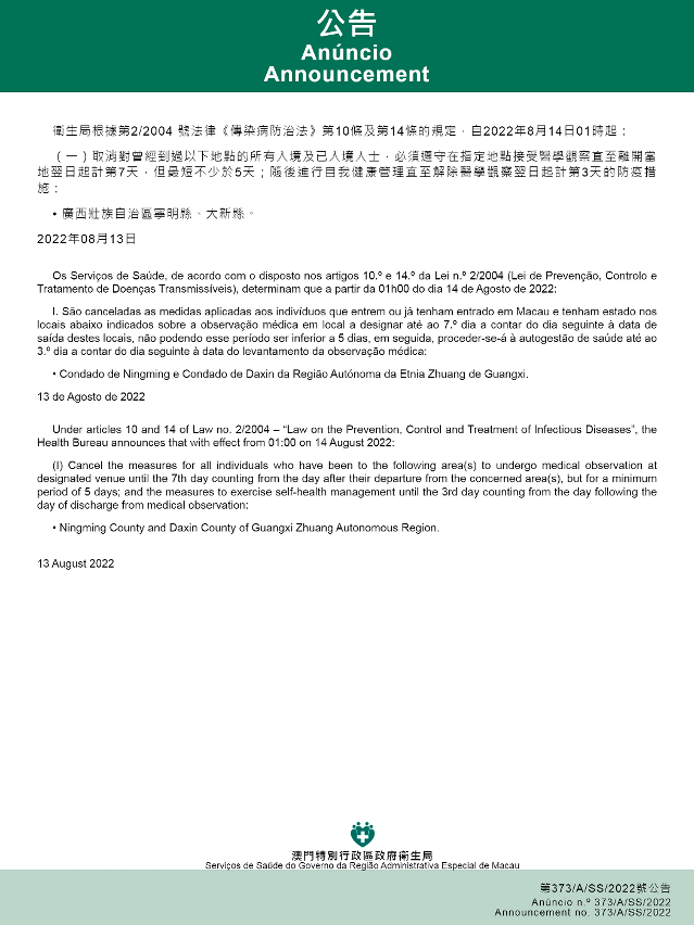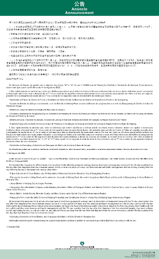 Tendo em consideração a evolução epidemiológica mais actualizada no Interior da China, os Serviços de Saúde, de acordo com o disposto nos artigos 10.º e 14.º da Lei n.º 2/2004 (Lei de Prevenção, Controlo e Tratamento de Doenças Transmissíveis), determinam que a partir da 01h00 do dia 14 de Agosto de 2022, são implementadas ou canceladas as medidas antiepidémicas para quem tenha estado em diversas áreas do Interior da China: