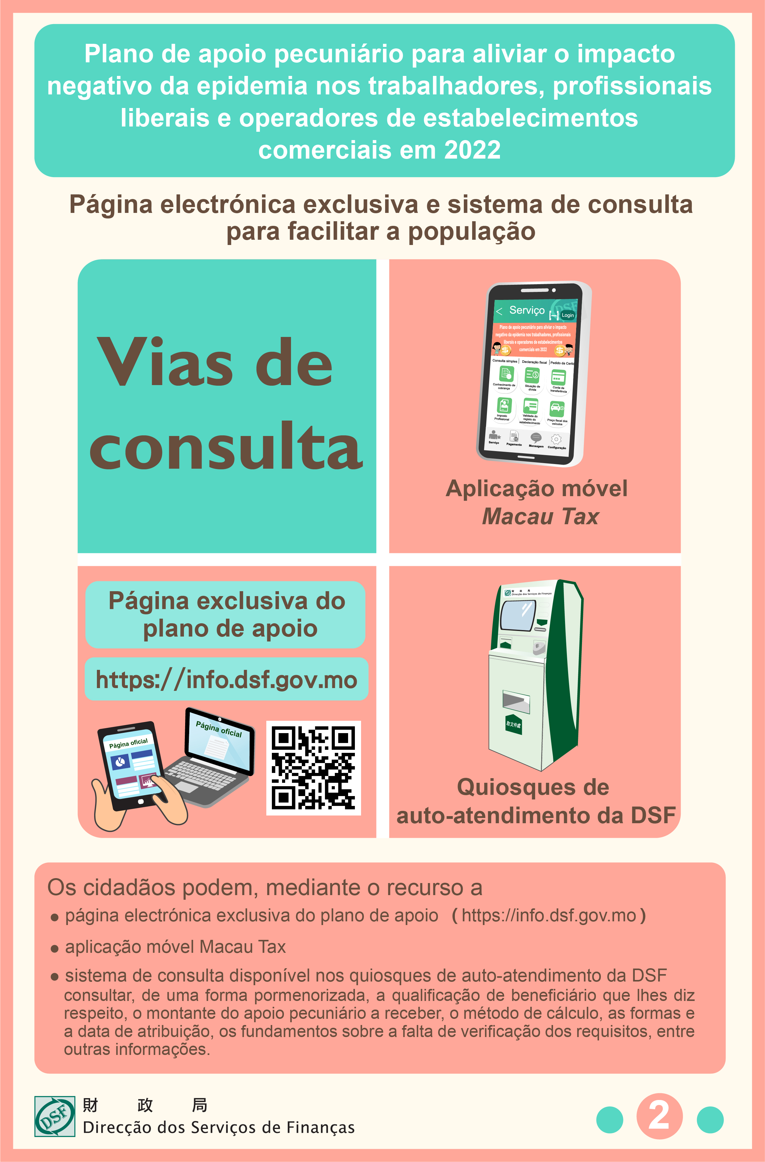 Os cidadãos podem, mediante o recurso à página electrónica exclusiva do plano de apoio (https://info.dsf.gov.mo), à aplicação móvel Macau Tax ou ao sistema de consulta disponível nos quiosques de auto-atendimento da DSF, consultar, de uma forma pormenorizada, a qualificação de beneficiário que lhes diz respeito, o montante do apoio pecuniário a receber, o método de cálculo, as formas e a data de atribuição, os fundamentos sobre a falta de verificação dos requisitos, entre outras informações.