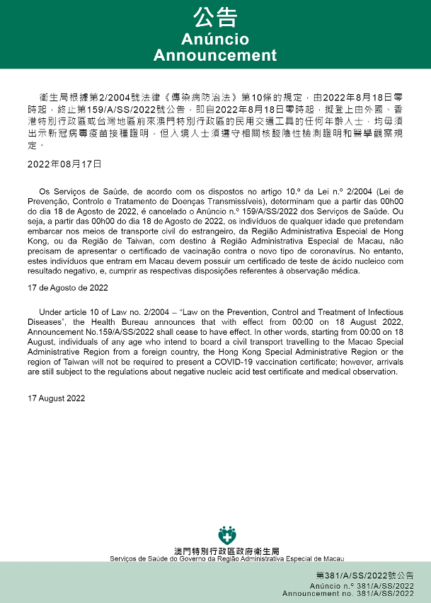 O Centro de Coordenação de Contingência do Novo Tipo de Coronavírus informa que, em conformidade com o Anúncio n.º 381/A/SS/2022 divulgado pelos Serviços de Saúde, a partir das 00h00 do dia 18 de Agosto de 2022, é cancelado o Anúncio n.º 159/A/SS/2022. Ou seja, a partir das 00h00 do dia 18 de Agosto de 2022, os indivíduos, de qualquer idade, que pretendam embarcar em meios de transporte civil do estrangeiro, da Região Administrativa Especial de Hong Kong ou da Região de Taiwan, com destino à Região Administrativa Especial de Macau, não precisam de apresentar o certificado de vacinação contra o novo tipo de coronavírus.
