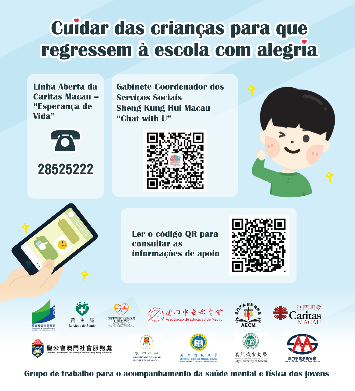 Para proteger a saúde pessoal, dos familiares e do público, a DSEDJ apela fortemente para que os estudantes, que tenham completado 3 anos de idade, se vacinem contra a COVID-19, com a maior brevidade, encorajando os docentes e estudantes, que reúnem os requisitos necessários, a submeterem-se à vacinação do esquema vacinal completo e à dose de reforço, o mais rápido possível.