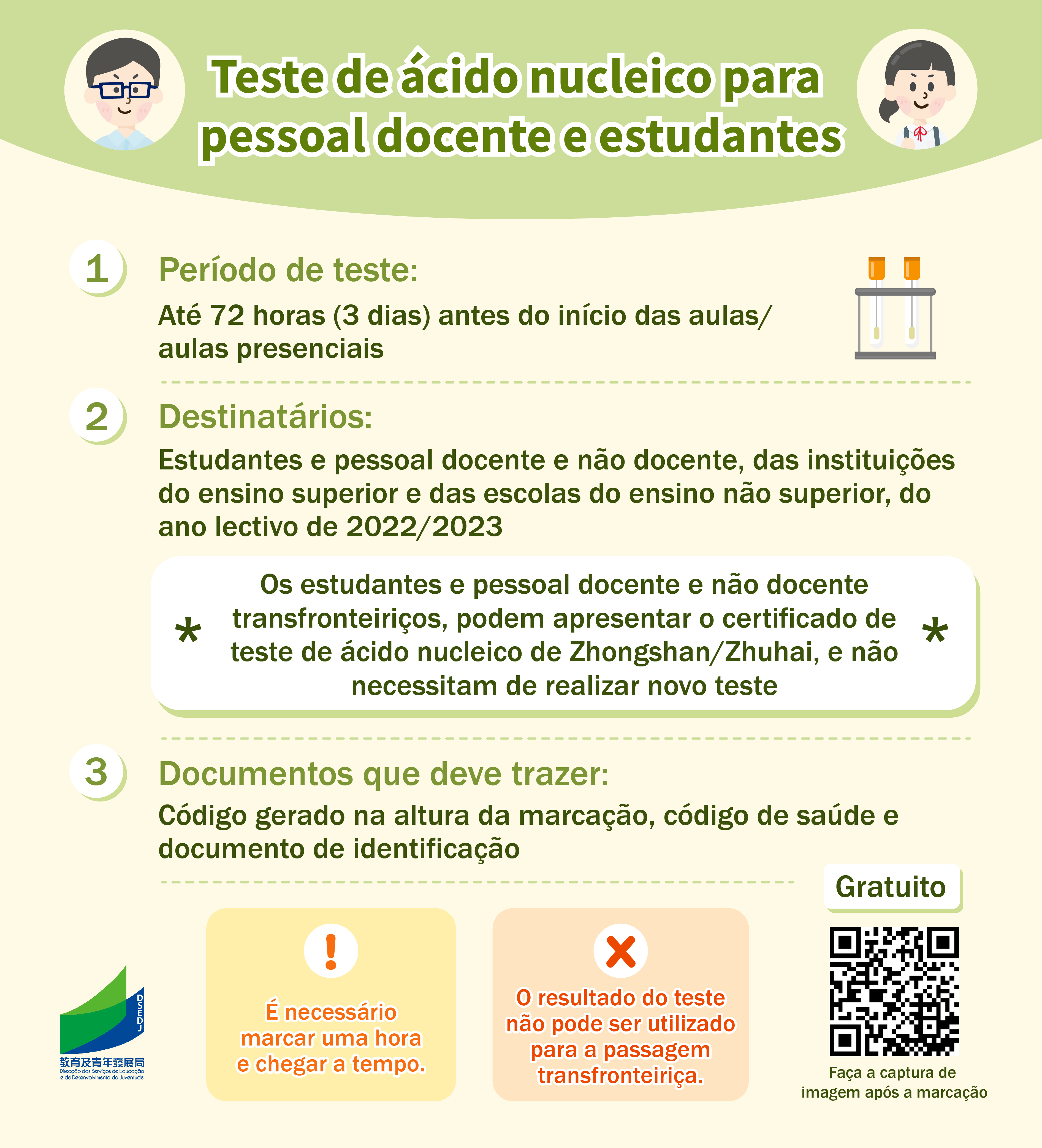 Para garantir as condições de saúde e de segurança dos docentes e estudantes, a DSEDJ anunciou, na primeira metade de Agosto, que os estudantes e docentes e funcionários das instituições de ensino superior e das escolas de ensino não superior têm de regressar ao seu local de residência permanente (Macau, Zhuhai ou Zhongshan) no prazo de 10 dias antes da data de início das aulas, e possuir, no dia de início de aulas, um comprovativo da colheita de amostra do teste de ácido nucleico, realizada dentro de 72 horas antes (3 dias). A fim de facilitar a marcação, foi lançado um sistema de marcação de teste de ácido nucleico exclusivo para docentes e estudantes ( https://app.ssm.gov.mo/studentrnabook ). Estes têm de efectuar a marcação para poderem fazer o teste, não devem chegar demasiado cedo (com antecedência de 30 minutos) nem chegar atrasado, no sentido de evitar a concentração das pessoas. O resultado deste teste não serve para passar na fronteira, nem substitui a realização periódica do teste de ácido nucleico para os grupos profissionais chave. Os estudantes, os docentes e funcionários transfronteiriços podem realizar o teste em Zhuhai ou Zhongshan, e não precisam de regressar a Macau para o efeito. Além disso, os docentes, funcionários dos estabelecimentos de ensino superior e não superior, bem como estudantes das instituições de ensino superior, devem apresentar o comprovativo do esquema vacinal completo contra COVID-19 ou apresentar, semanalmente, os resultados negativos do teste de ácido nucleico em sete dias.